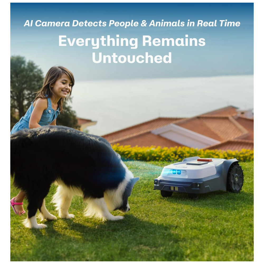 A detecção de obstáculos em tempo real utiliza câmeras de IA para identificar objetos, pessoas e animais, ajustando trajetórias automaticamente. Inclui sensores de elevação e inclinação que param o equipamento imediatamente. A lâmina de corte de 20 cm garante precisão com mulching, promovendo distribuição uniforme de aparas.