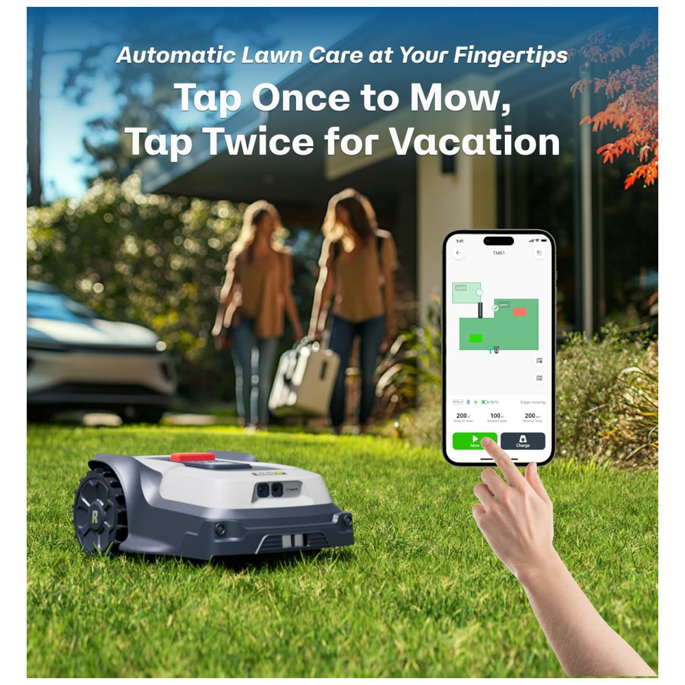 A configuração ocorre em cinco etapas via aplicativo RoboUP, compatível com iOS e Android, permitindo programação de horários, altura de corte ajustável de 3 a 6 cm, definição de zonas e ângulos de poda. O motor elétrico a bateria fornece operação autônoma com recarga automática na estação de carregamento integrada.