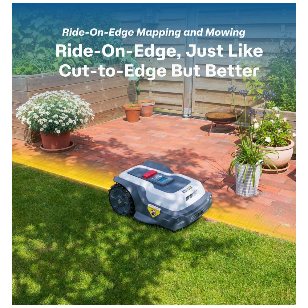 O design em plástico cinza com dimensões compactas facilita o transporte e armazenamento. Opera em modo automático com controle total pelo app, incluindo retorno à base noturno programável. Ideal para gramados complexos com suporte a extensão RTK para maior cobertura.