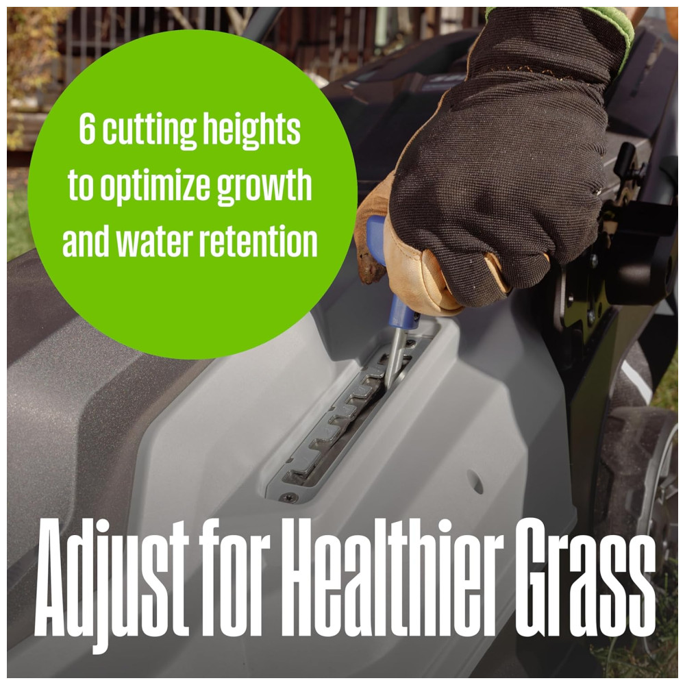 Ajuste de corte em seis posições, variando de 2,5 cm a 7,6 cm, permite personalizar a altura do gramado conforme necessidade. O plugue de mulching incluso transforma a grama cortada em fertilizante natural.
