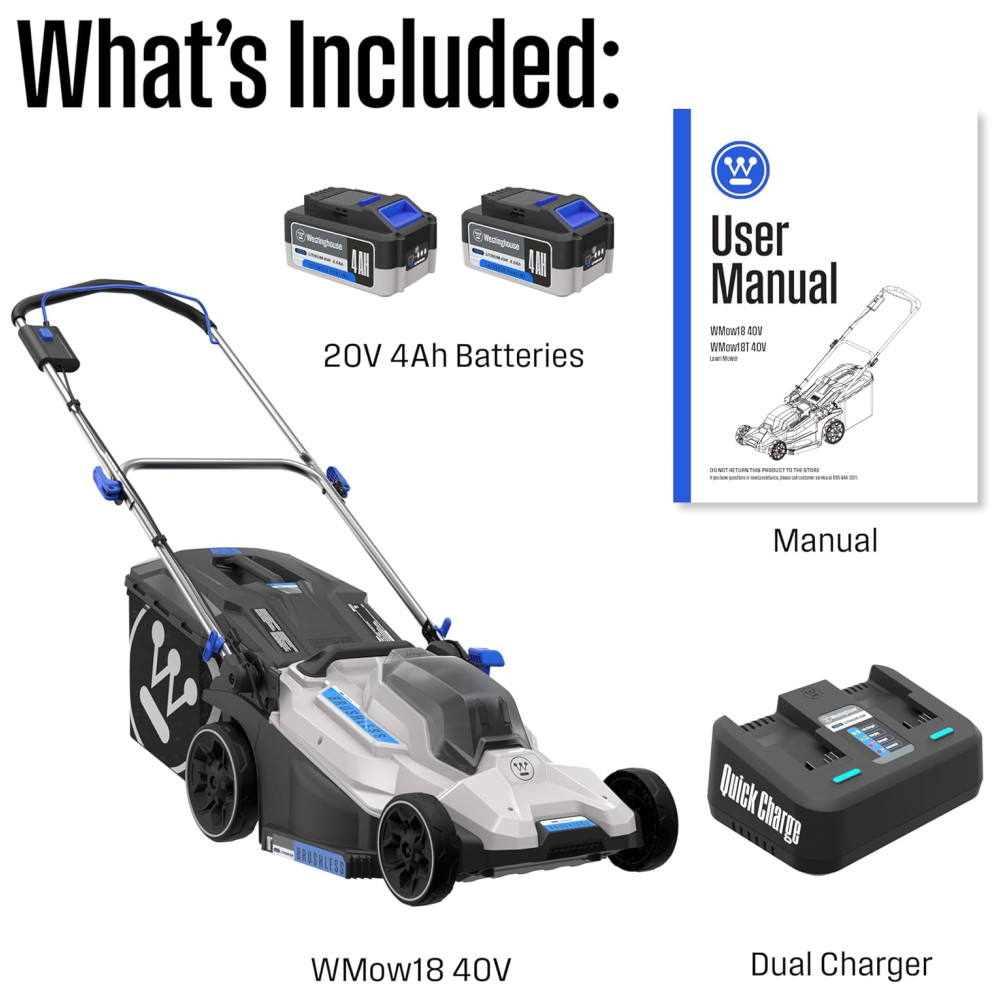 O cortador de grama sem fio Westinghouse 40V modelo WMow18 40V oferece desempenho elétrico eficiente com motor brushless alimentado por duas baterias de 20V de 4.0Ah, proporcionando até 25 minutos de uso contínuo. A largura de corte é de 46 cm, com corte de ponta a ponta para maximizar a área coberta em cada passagem.