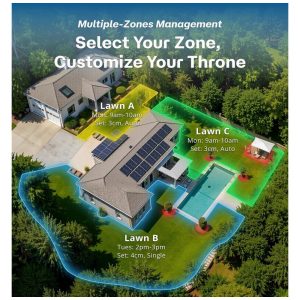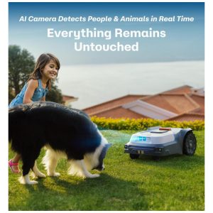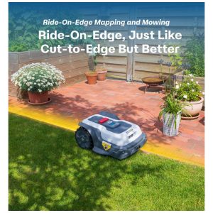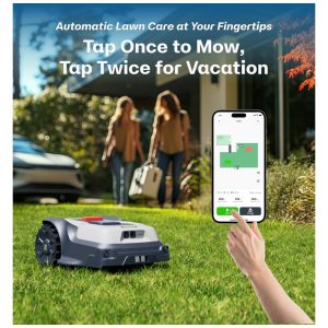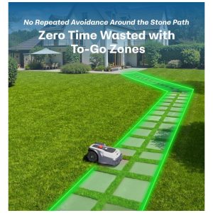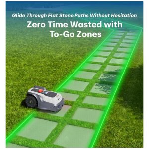 Sistema de visão AI com câmeras detecta obstáculos em tempo real, ajustando trajetórias e parando instantaneamente se levantado ou inclinado. Corte paralelo com ajuste automático de ângulo de 15° gera listras uniformes, com disco flutuante e 3 lâminas para precisão em 1 cm. Configuração em 5 passos inclui tutorial no app para zonas, cronogramas, edição de mapas virtuais e áreas de exclusão.