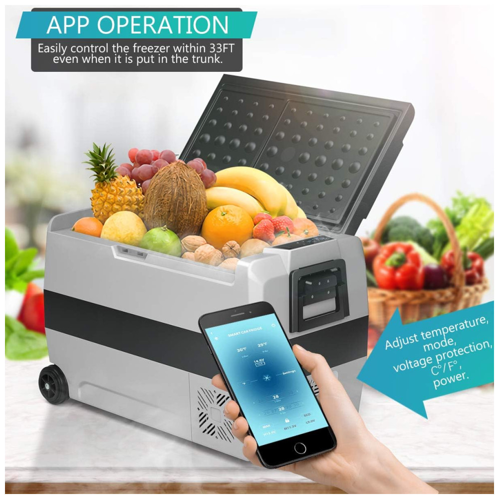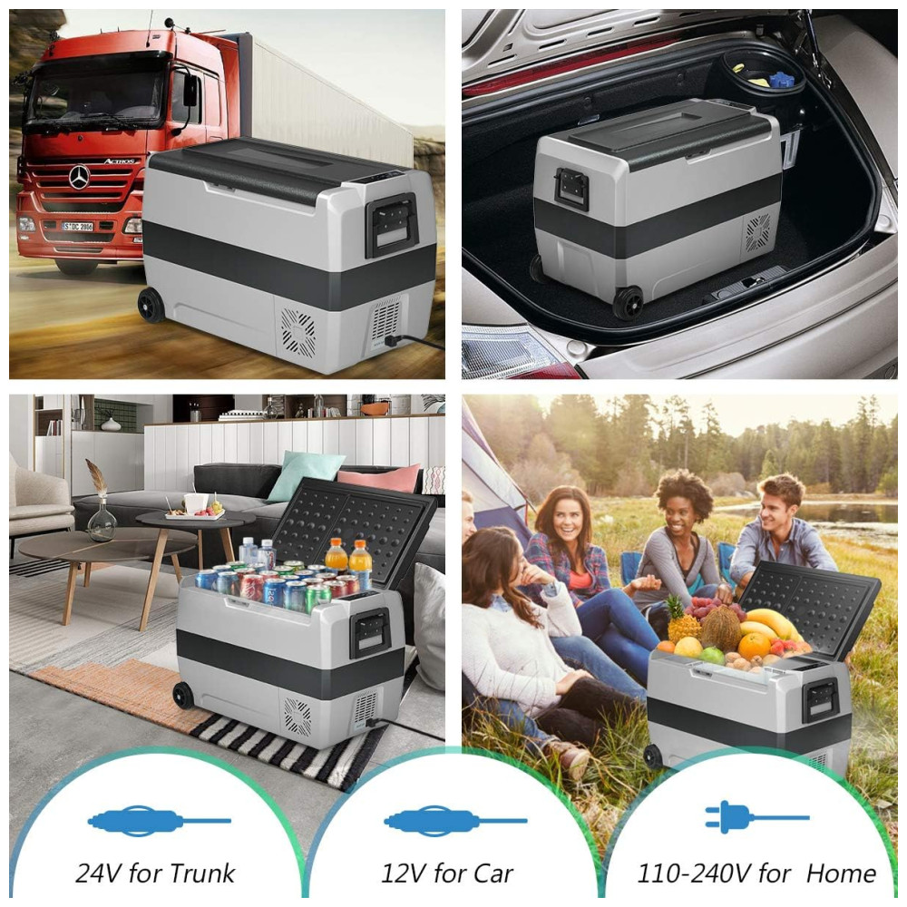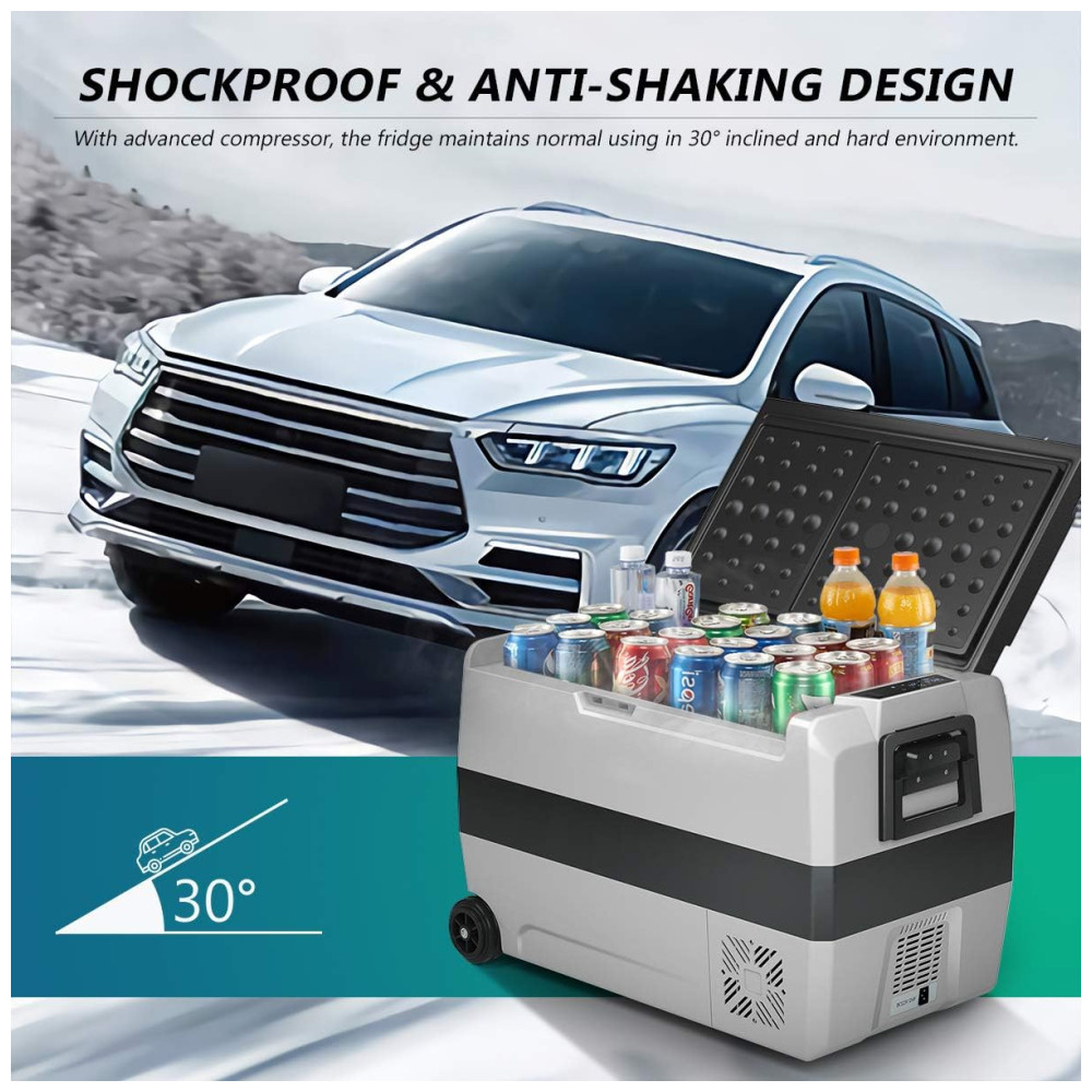 Proteção inteligente da bateria O refrigerador do carro vem com monitor de bateria de 3 níveis que pode proteger as baterias do automóvel. Além disso, com design à prova de choque para estradas irregulares, ele também pode funcionar com uma tomada doméstica padrão de 100 V a 240 V ou uma fonte de alimentação de 12, 24 V, como uma bateria automotiva