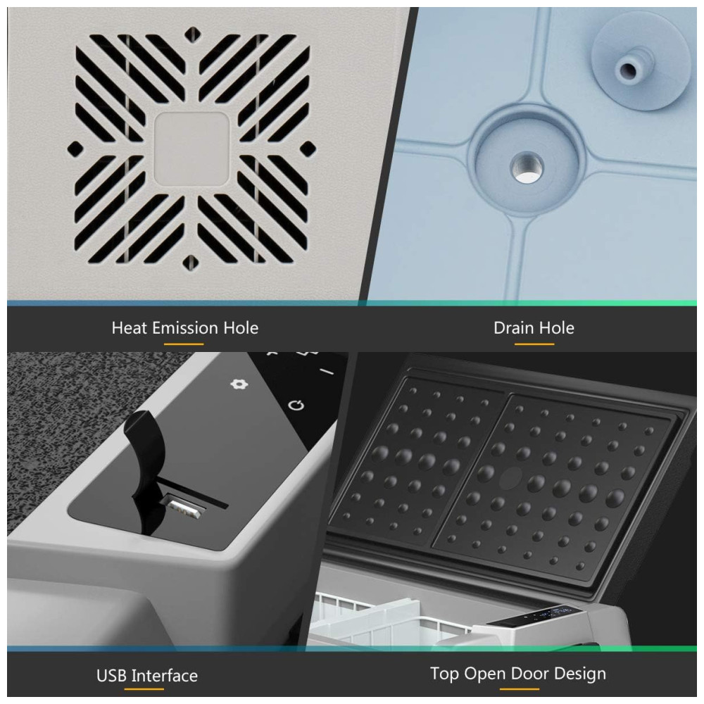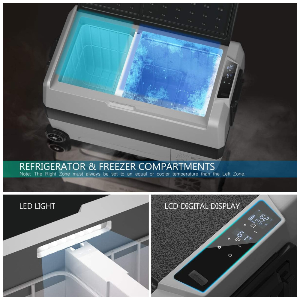 Design de zona dupla separada Nosso refrigerador para veículos consiste em 2 áreas de refrigeração e congelamento. Itens diferentes podem ser colocados em áreas diferentes. O uso de partição removível atinge opções de zenamento razoáveis. E, seu painel de exibição fácil de operar também está presente para controlar a temperatura em Fahrenheit e Celsius.