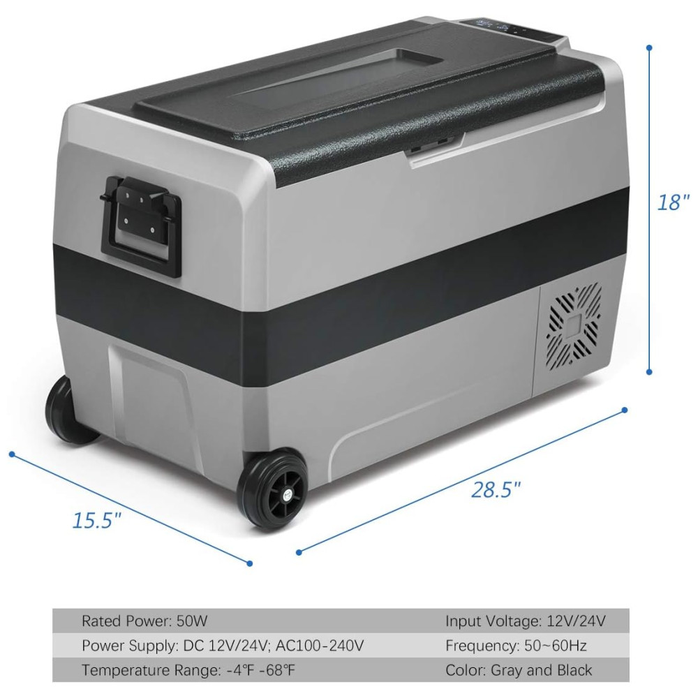 Capacidade compacta e portabilidade perfeita com uma capacidade de 50L, este refrigerador portátil vem com vários itens essenciais. É ótimo para transportar durante viagens e acampamentos. A alça embutida e 2 rodas facilitam para você mover e transportar até o seu destino.