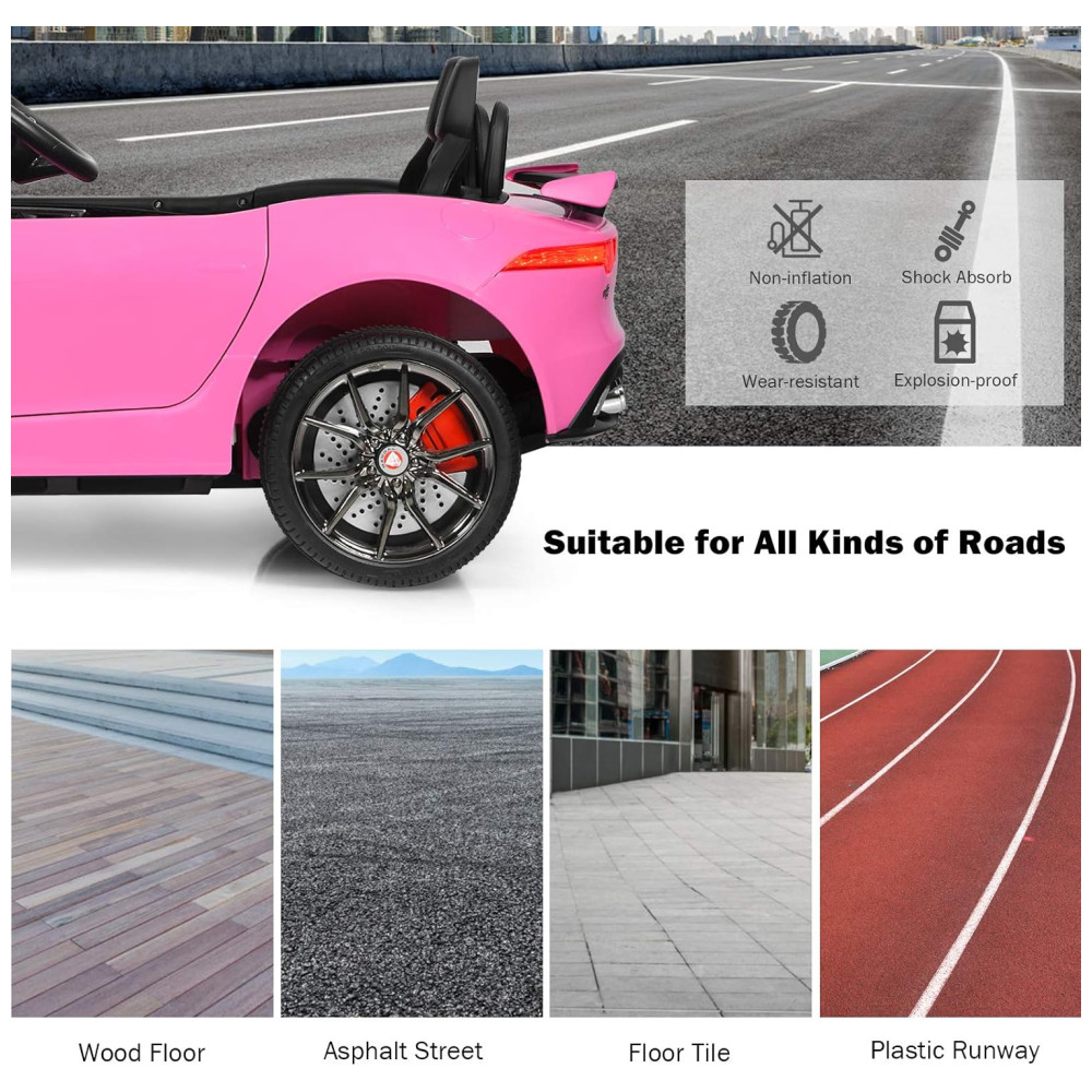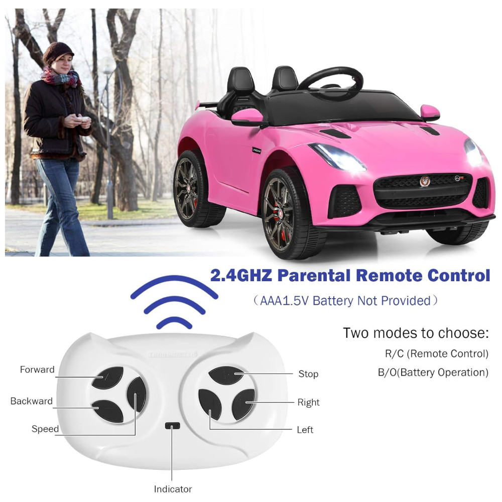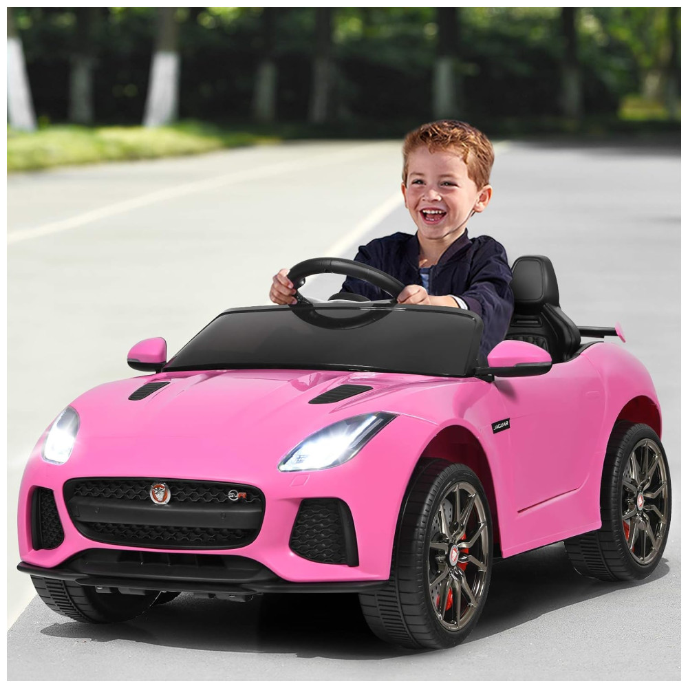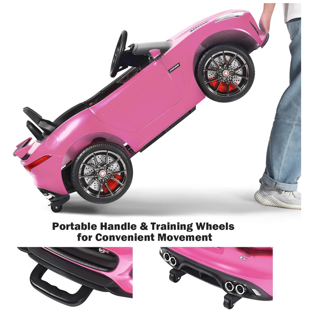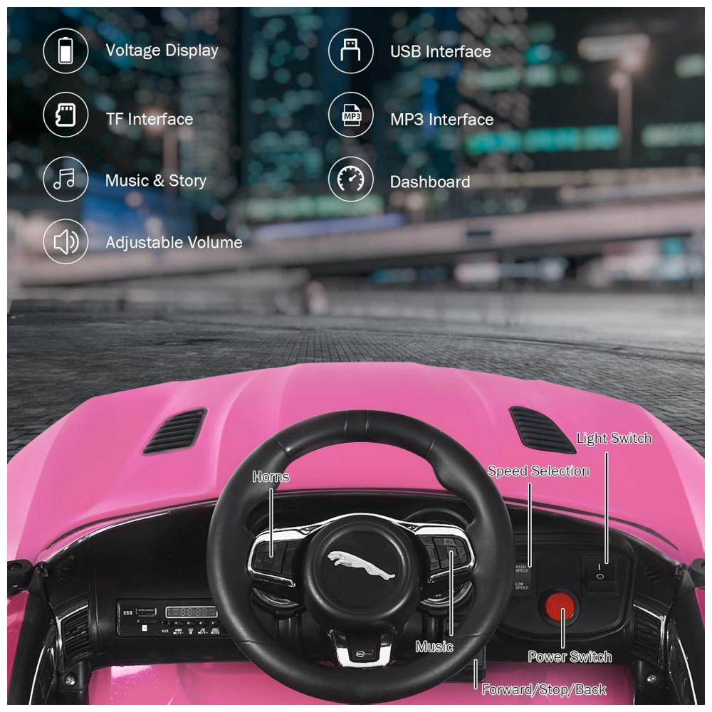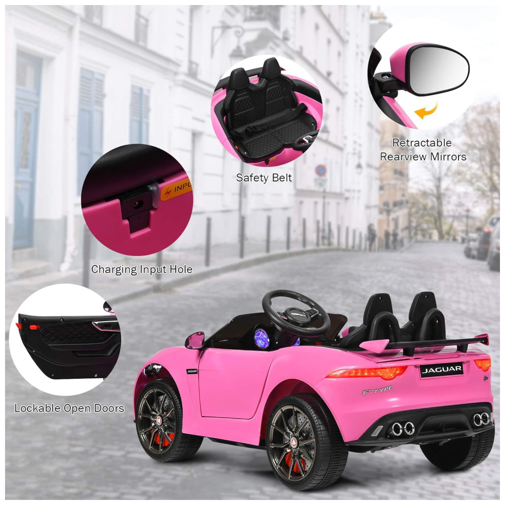 Passeio no carro licenciado legal Este passeio no carro Jaguar F type oficialmente licenciado tem uma aparência legal e elegante, juntamente com faróis e buzinas. Apresentando tubos de escape duplos e espelhos, ele imita muito o carro real. Além disso, o design de abertura de porta dupla torna mais fácil para os bebês entrar e sair sem problemas.