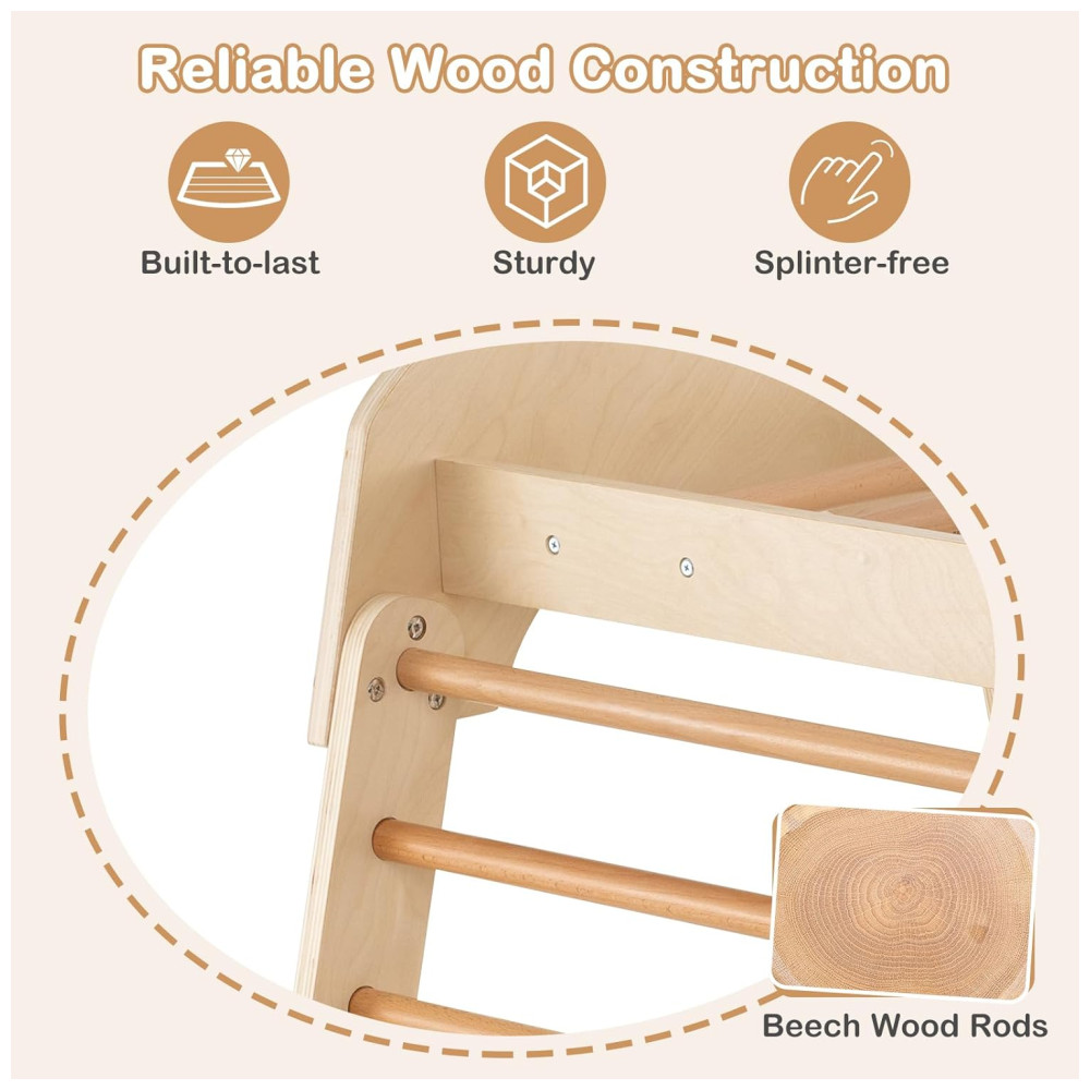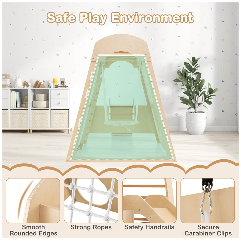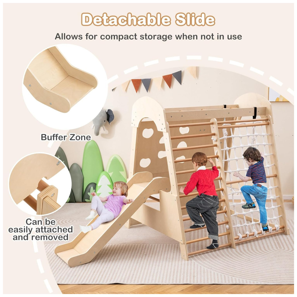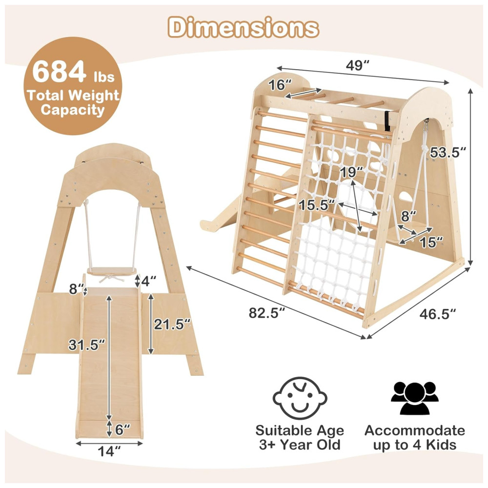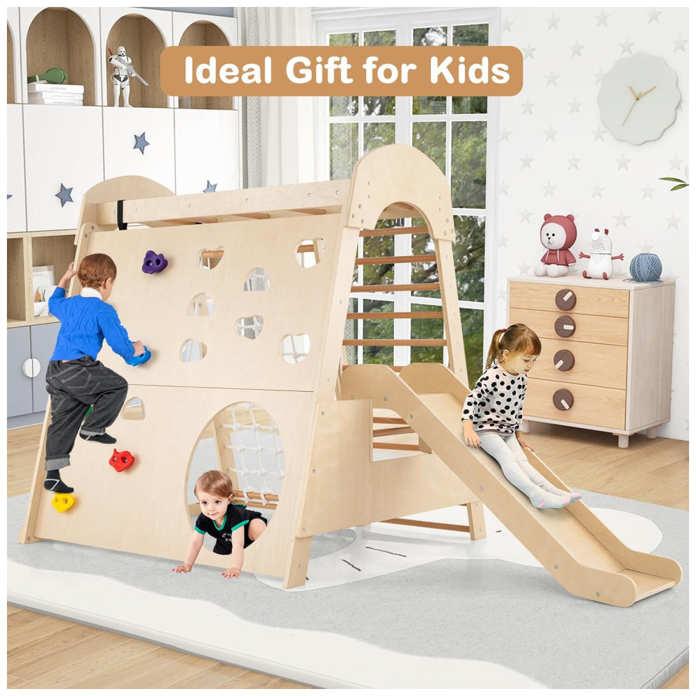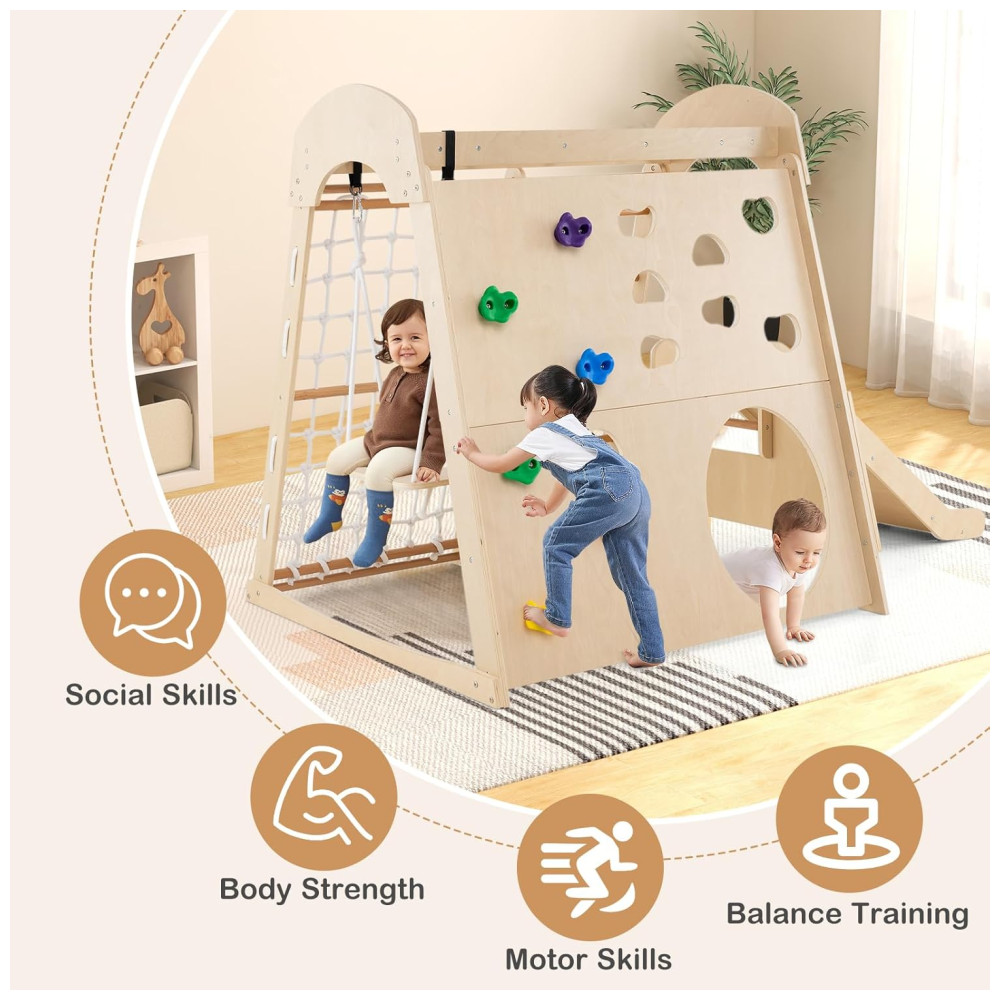 Transforme sua casa em um playground divertido com o playground indoor 8 em 1 da Costzon! Feito para brincadeiras ativas, este playground de madeira inclui escorregador, escada de madeira, rede de escalada, balanço, parede de escalada, túnel rastejante e barras de macaco, garantindo horas de entretenimento. O escorregador de 3 seções possui zona de amortecimento e corrimãos para maior segurança, podendo ser desmontado facilmente. Feito de madeira resistente e sem lascas, oferece durabilidade e ambiente de jogo seguro. Sua estrutura trapezoidal suporta até 4 crianças. Este conjunto promove força, coordenação, equilíbrio e habilidades sociais, sendo um presente ideal para crianças de 3 anos. Acompanha certificação ASTM e CPSIA.