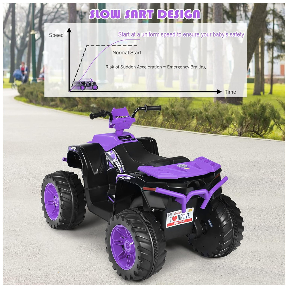 Proteção mais elevada com função de arranque lento o passeio no ATV adota tecnologia de arranque lento avançada que se destina a proteger os seus filhos durante o tempo de condução manual, caso o início rápido possa assustá los, embora o assento largo que se adapta bem ao corpo das crianças forma leva o nível de conforto para o próximo nível.