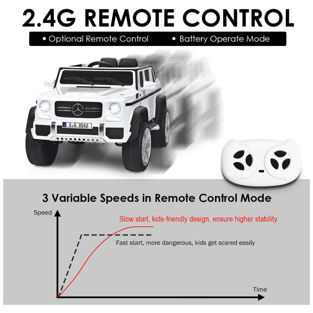Dois modos de operação A viagem recarregável no carro permite que seus filhos desfrutem de uma experiência de direção realista por meio do botão liga , desliga, botão de avanço , ré, botão de alta , baixa velocidade e pedal. Ele também vem com um controle remoto 2.4G que permite aos pais controlar a direção e a velocidade do movimento.