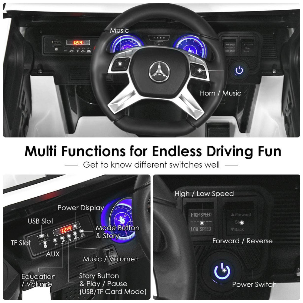 Múltiplas funções para diversão sem fim Considerando que as crianças podem se cansar de dirigir, o passeio no carro é construído com várias funções de entretenimento para animá las. Luzes LED brilhantes e buzina alta adicionam mais diversão enquanto a música dinâmica aumenta seu vigor. Além disso, possui uma interface USB, slot TF e porta AUX, projetada para fornecer uma grande quantidade de músicas que seus filhos preferem.