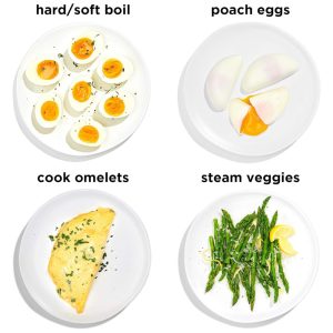 PRONTO PARA O PEQUENO ALMOÇO Não há necessidade de esperar que os ovos cozidos esfriem para movê los após o cozimento. Com a ferramenta de levantamento de bandeja, você pode tomar seu brunch com ovos quentes recém cozidos. Quer goste de ovos cozidos ou moles, mexidos, omeletes ou escalfados, o pequeno almoço nunca foi tão fácil