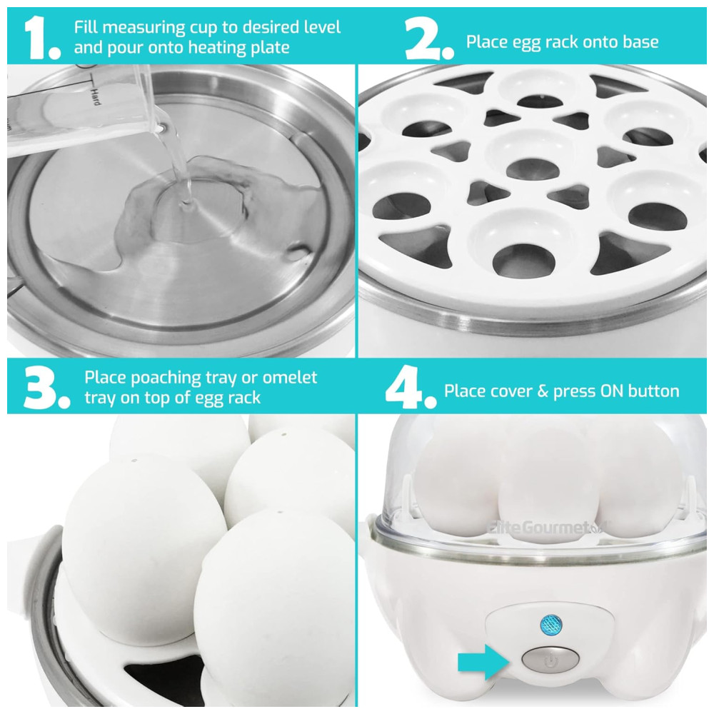 FACILIDADE DE USO Encha o copo medidor com água até o ponto desejado, pressione o botão liga , desliga uma vez e em minutos seus ovos estarão Egg Celent Divertido e simples de usar para familiares de todas as idades O temporizador integrado, a campainha e o desligamento automático acertam sempre Mais rápido do que os métodos convencionais de fogão