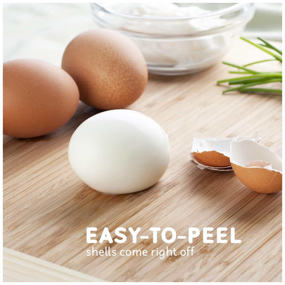CAPACIDADE DE SETE OVOS Cozinhe até 7 ovos em firmeza de fervura mole, média ou dura, economizando tempo e água. Os ovos saem consistentemente perfeitos, a casca é fácil de descascar e a limpeza é super fácil