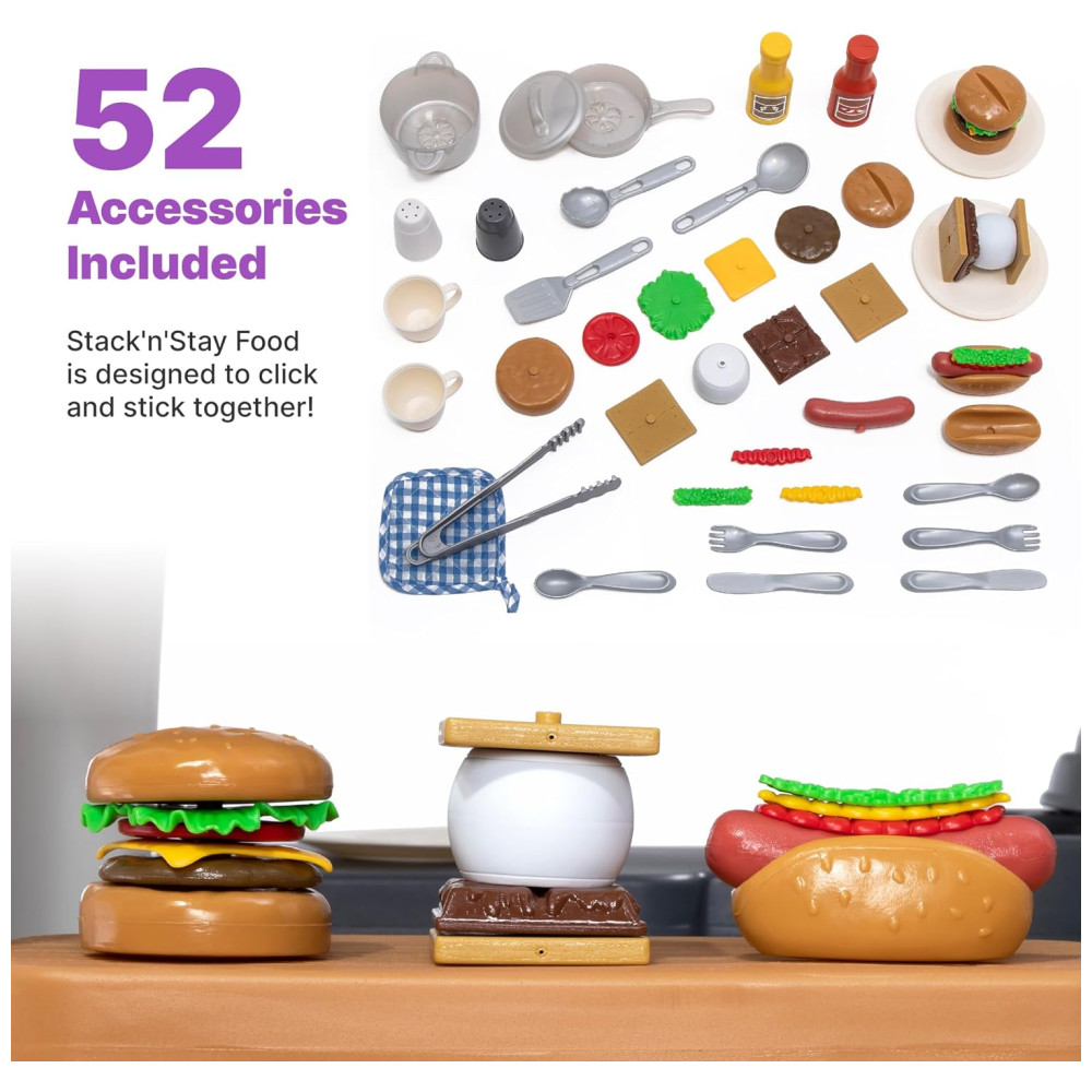 Brinquedos Interativos: Inclui sons realistas e um conjunto completo de 52 acessórios de cozinha, como panela, pinça, luva de forno, bandejas, pratos, utensílios, s’mores e alimentos, para tornar as brincadeiras ainda mais envolventes.