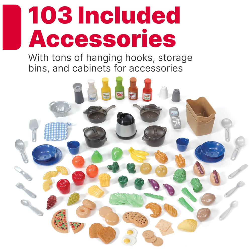 MAIS DE 100 ACESSÓRIOS INCLUÍDOS Este Step2 Kitchen Playset inclui tudo o que você precisa para começar a jogar O kit de acessórios de 103 peças vem com tudo que seus filhos precisam para começar a brincar em sua própria cozinha, incluindo comida, condimentos, pratos e utensílios.