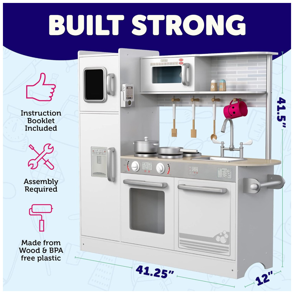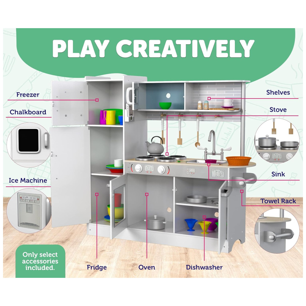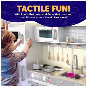 FÁCIL DE MONTAR E LIMPAR Nossa cozinha Play vem com dobradiças pré instaladas e possui peças removíveis que podem ser lavadas facilmente para manter a cozinha arrumada para as crianças. Nossa cozinha fingida é uma grande oportunidade para seus filhos aprenderem o valor de serem responsáveis por sua própria bagunça e limpar o jogo.