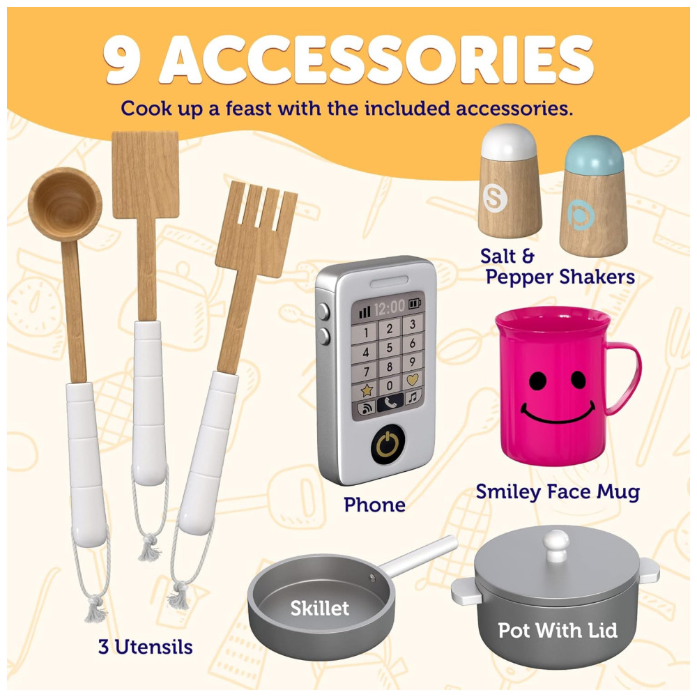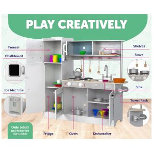 ACESSÓRIOS MÚLTIPLOS O nosso conjunto de brinquedos para crianças em cozinha vem com muitos acessórios, incluindo 2 saleiros, um conjunto de panela e panela, 3 utensílios e uma xícara. Conjunto de cozinha de design moderno com suporte para toalhas, prateleira para geladeira, opção de prender na parede, botões de forno girando e um controle remoto fingido faz da cozinha dos nossos filhos um presente ideal para o aniversário das crianças e o Natal. Nossa cozinha Play é adequada para as crianças de 3 anos Um brinquedo ideal para aprender deve crescer com as crianças.