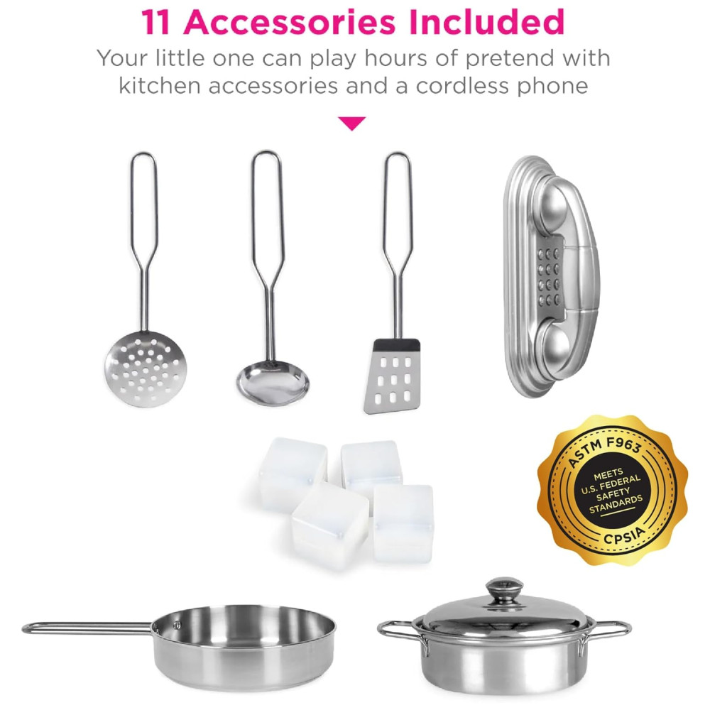 11 ACESSÓRIOS INCLUSOS Conjunto com 3 utensílios, 2 potes, 1 tampa para brincar e cozinha com ice maker que dispensa cubos de gelo 4, e ainda telefone sem fio mantenha os acessórios na prateleira superior de 1,88 metros quadrados, no forno de 10 metros quadrados ou na geladeira, freezer, micro ondas e lava louças