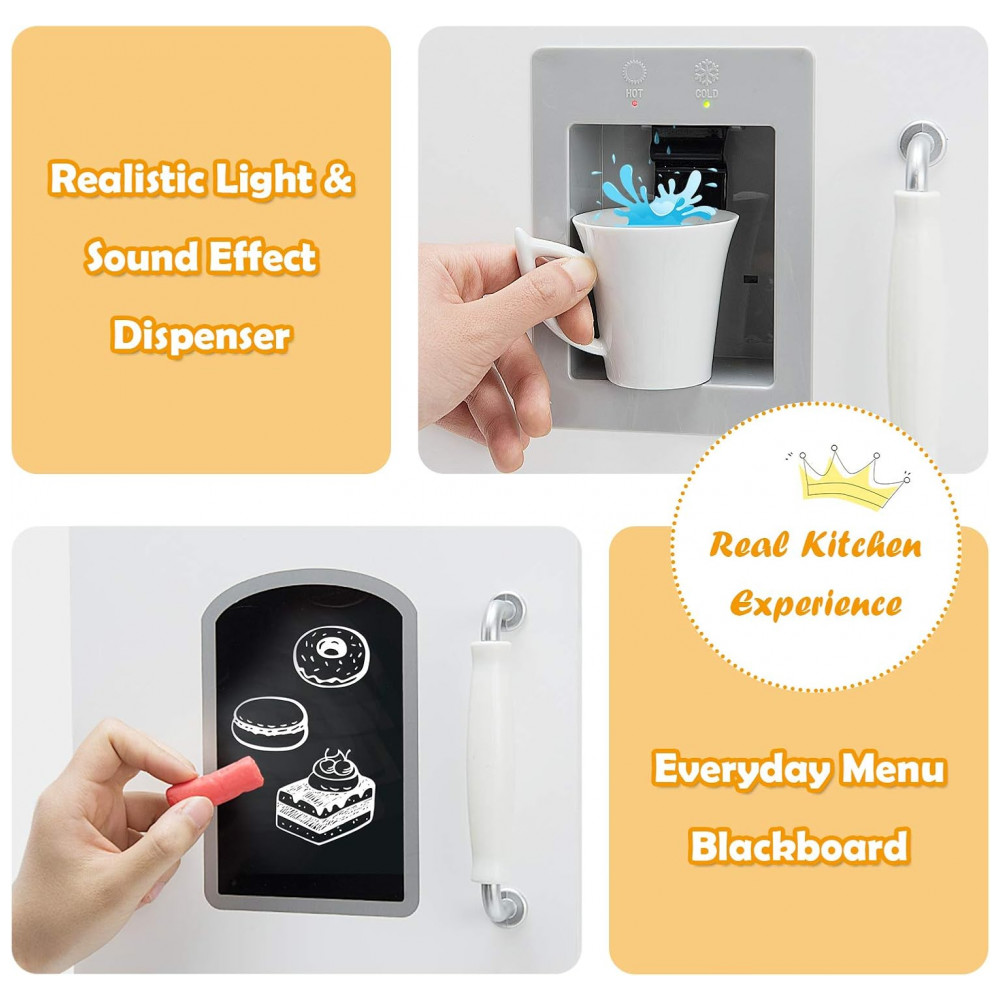 APARÊNCIA REALISTA A cozinha realista para crianças brincam proporcionará ao seu filho uma experiência de culinária autêntica, que apresenta fogão, pia, geladeira, relógio e botões com som. O dispensador de água é projetado com efeitos de luz e som, que simulam realisticamente a água de vazamento. Além disso, este conjunto de brinquedos de cozinha pode evitar os perigos de cozinhas reais.
