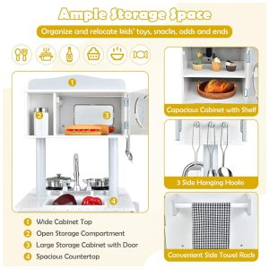 Espaço de zenamento simples Com tampo amplo do gabinete, compartimento de zenamento aberto, armário grande com porta e bancada espaçosa, o conjunto infantil da cozinha oferece amplo espaço para organizar e realocar crianças brinquedos, lanches, probabilidades e fins. Além disso, três ganchos laterais e um conveniente suporte de toalhas laterais aumentarão a flexibilidade de zenamento.