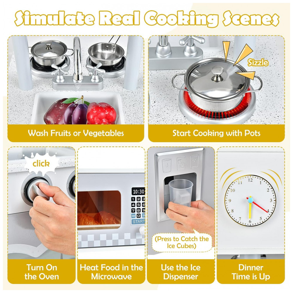 Simule cenas reais de culinária A hora do jantar acabou. Esta cozinha infantil é projetada com instalações realistas, permitindo que as crianças finjam cozinhar. Primeiro, lave frutas e legumes. Então, comece a cozinhar com panelas. Por fim, ligue o forno ou aqueça os alimentos no micro ondas. Melhor ainda, as crianças podem usar o dispensador de gelo para pegar os cubos de gelo