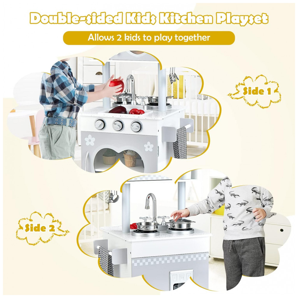 Conjunto de reprodução de cozinha infantil de dupla face Este conjunto de peças de cozinha para crianças 2 em 1 apresenta dois lados para 2 crianças brincarem juntas. Uma criança pode fingir lavar legumes e a outra pode interpretar refeições ao mesmo tempo. A altura da bancada especialmente adaptada 48 centímetros é um presente perfeito para crianças de 3 anos .