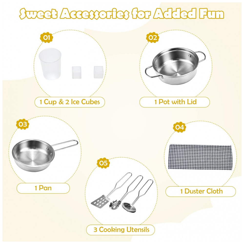 Acessórios doces para diversão adicionada Não há necessidade de comprar acessórios, pois o conjunto infantil de brincadeiras de cozinha está completo com 1 xícara e 2 cubos de gelo, 1 panela com tampa, 1 panela, 3 utensílios de cozinha e 1 pano de espanador. Tudo isso pode incentivar muito seu pequeno chef a brincar e aprender a identificar diferentes materiais de cozinha.