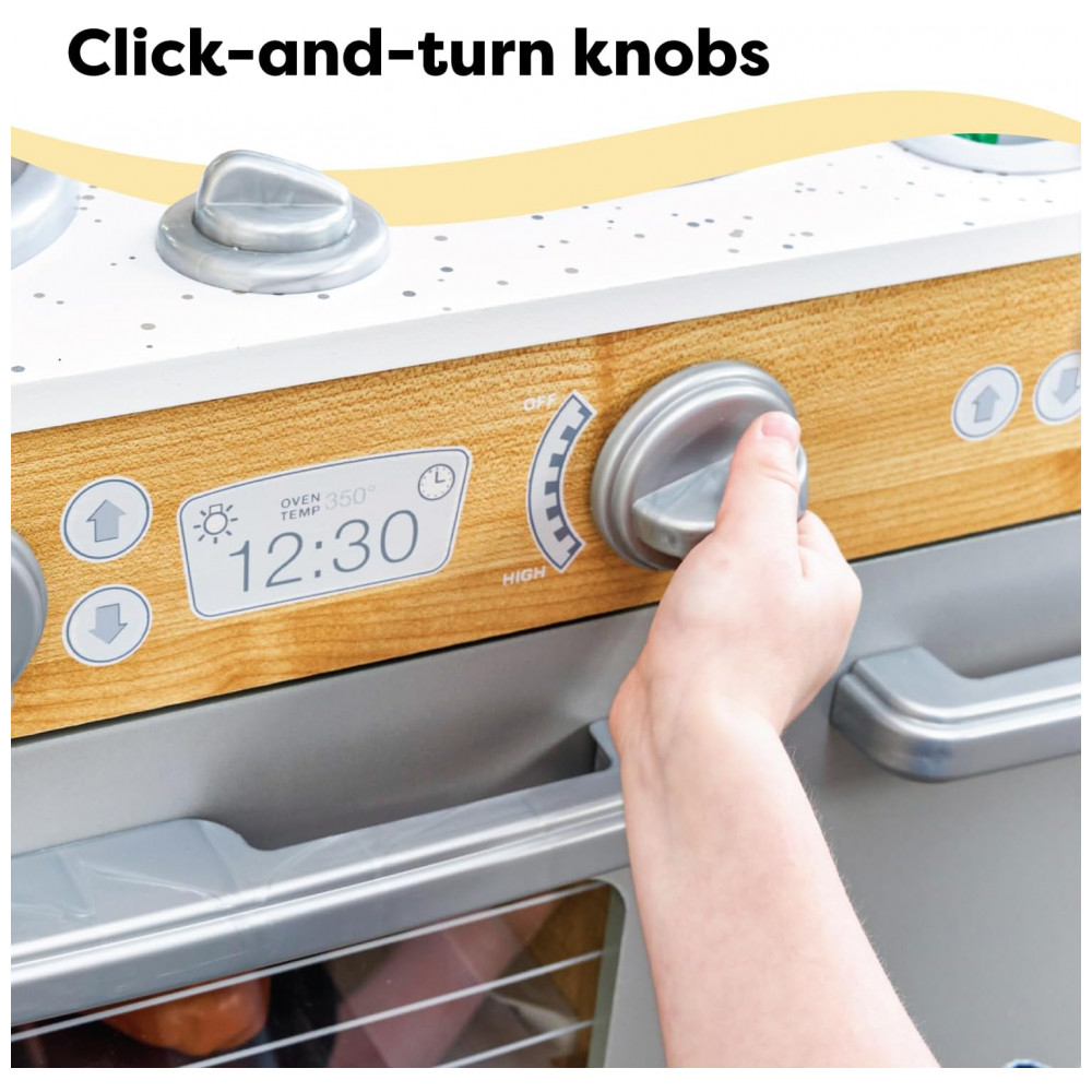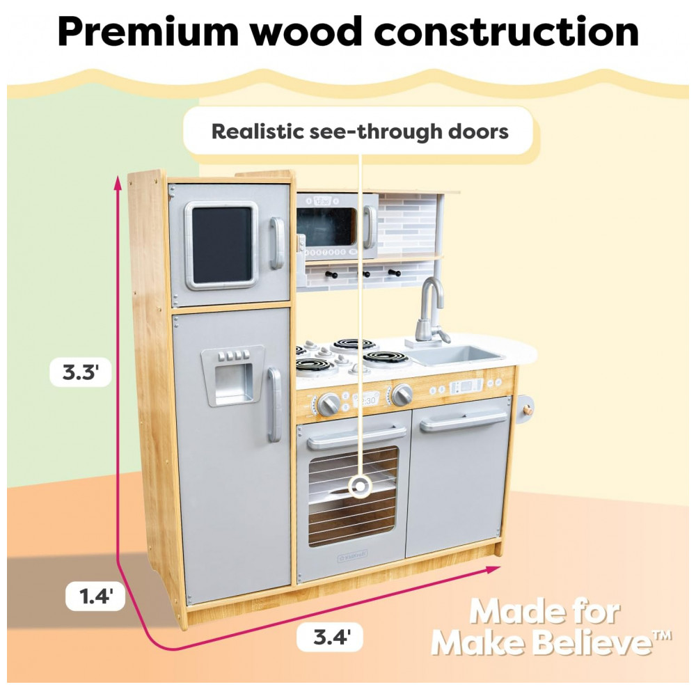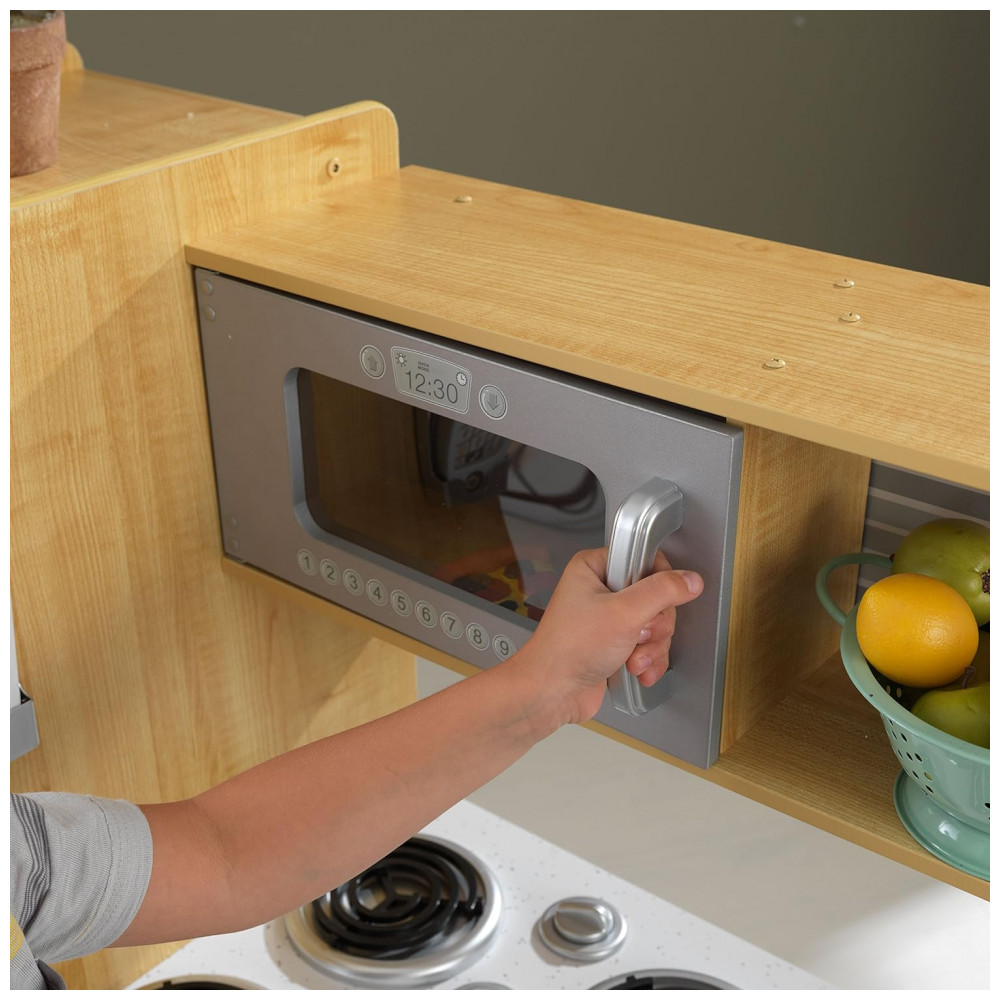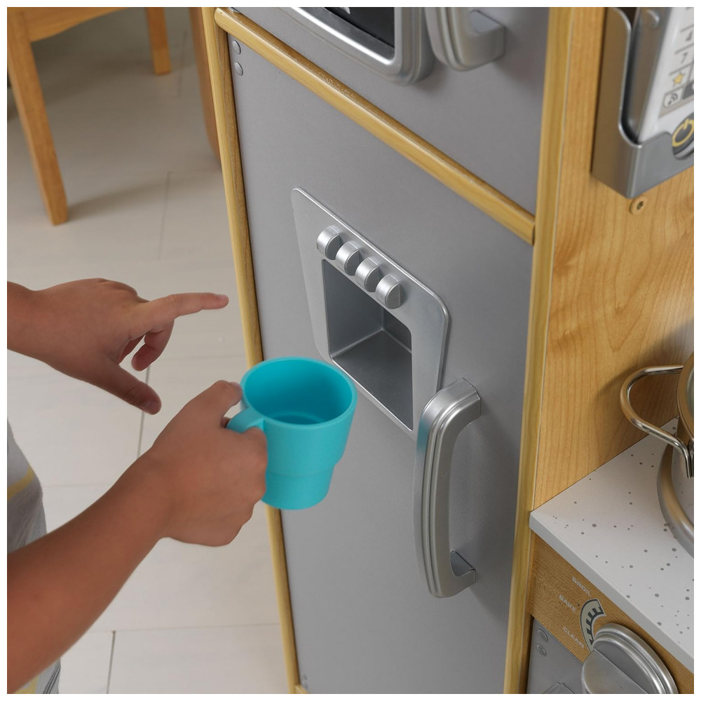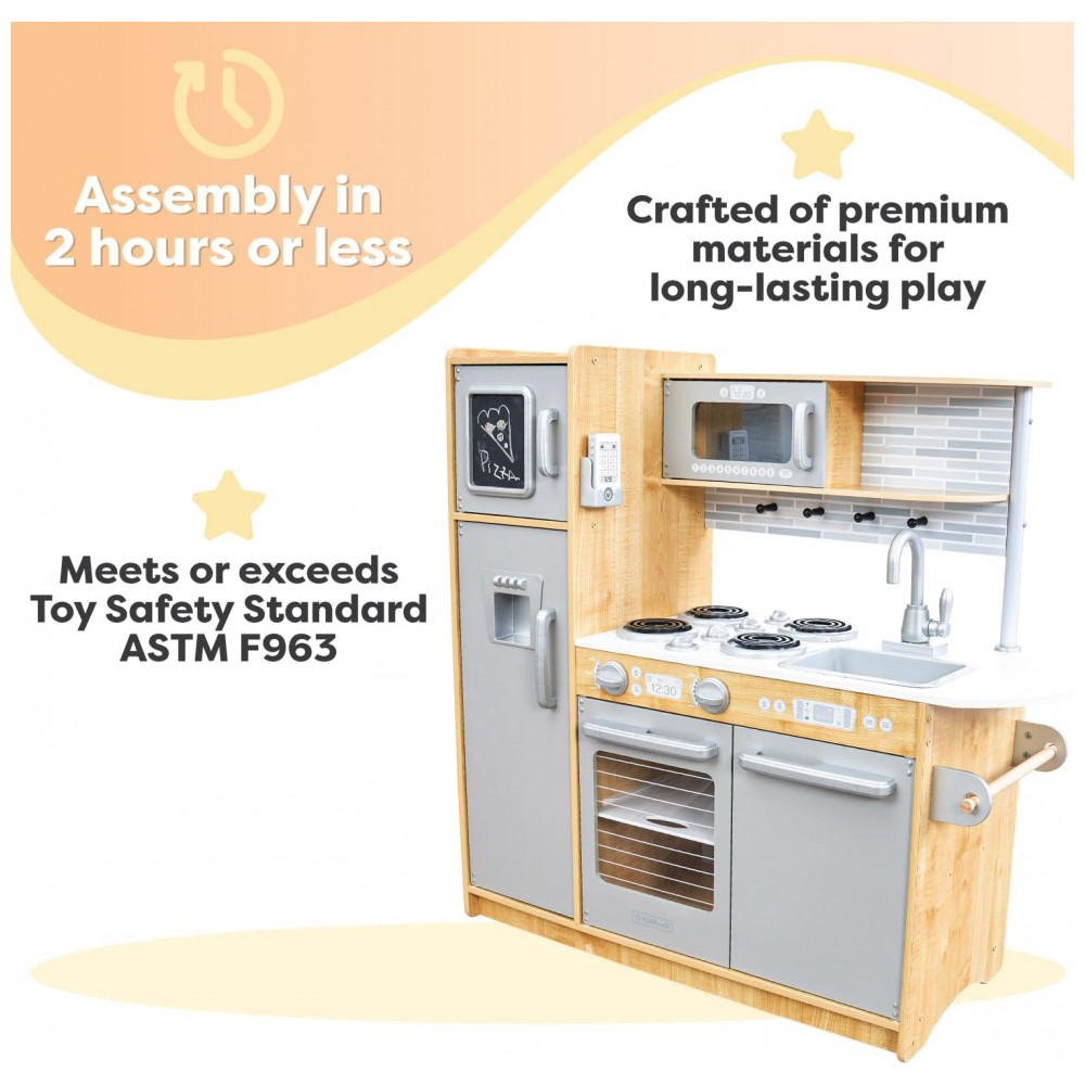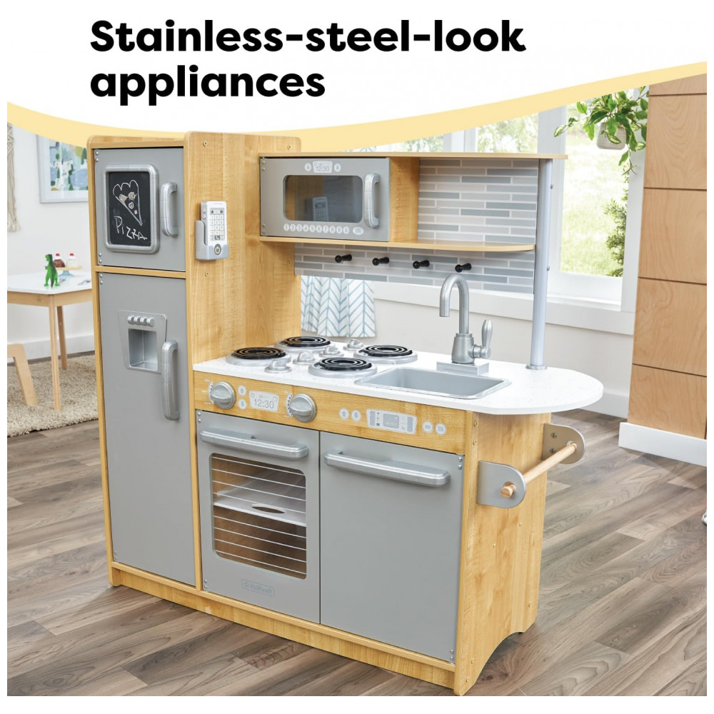 Hora de cozinhar um pouco de diversão. Nossa cozinha KidKraft Uptown Natural play tem uma aparência moderna e moderna que os jovens chefs certamente vão adorar. Todo aparelho é interativo, incluindo portas que se abrem e fecham, botões que giram e clicam e um quadro negro na porta do freezer. Criada em madeira composta, esta cozinha contemporânea é uma adição robusta e elegante ao tempo de reprodução.