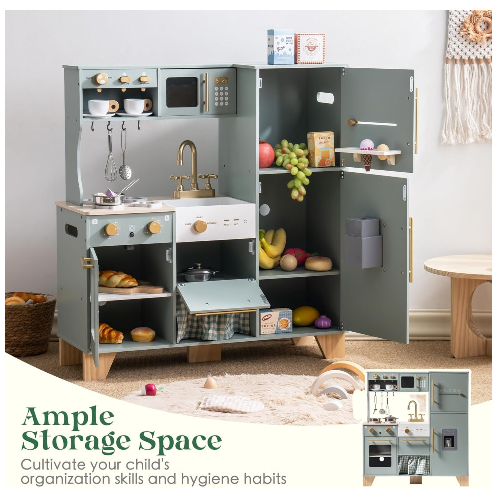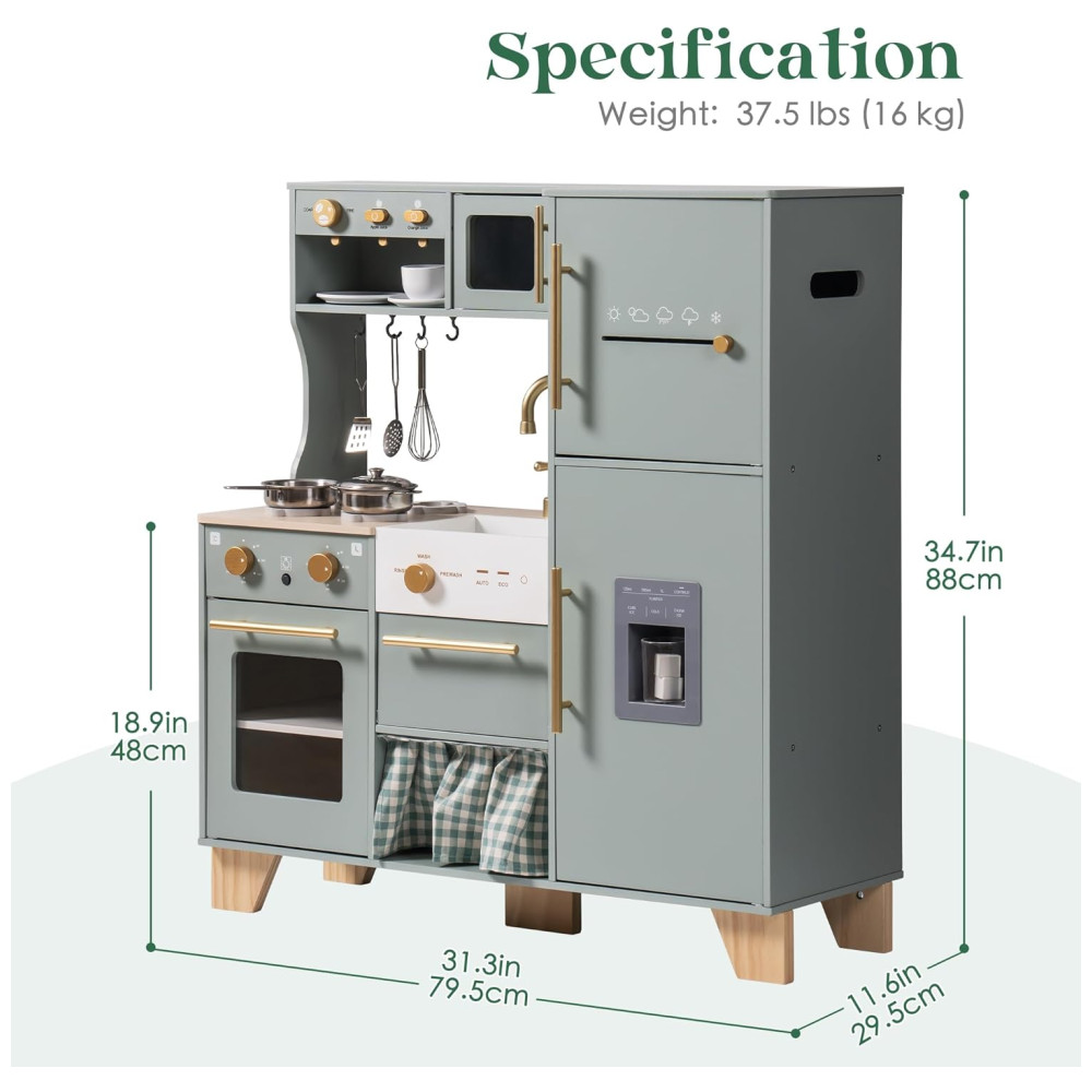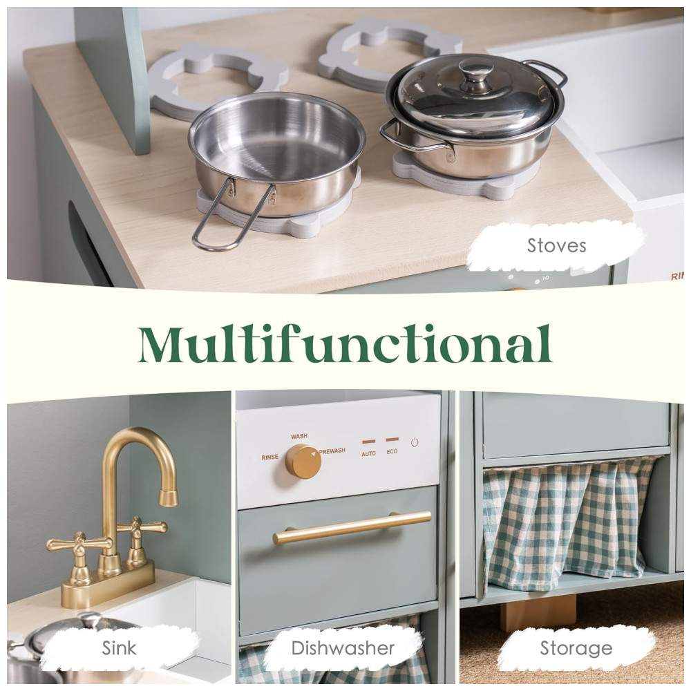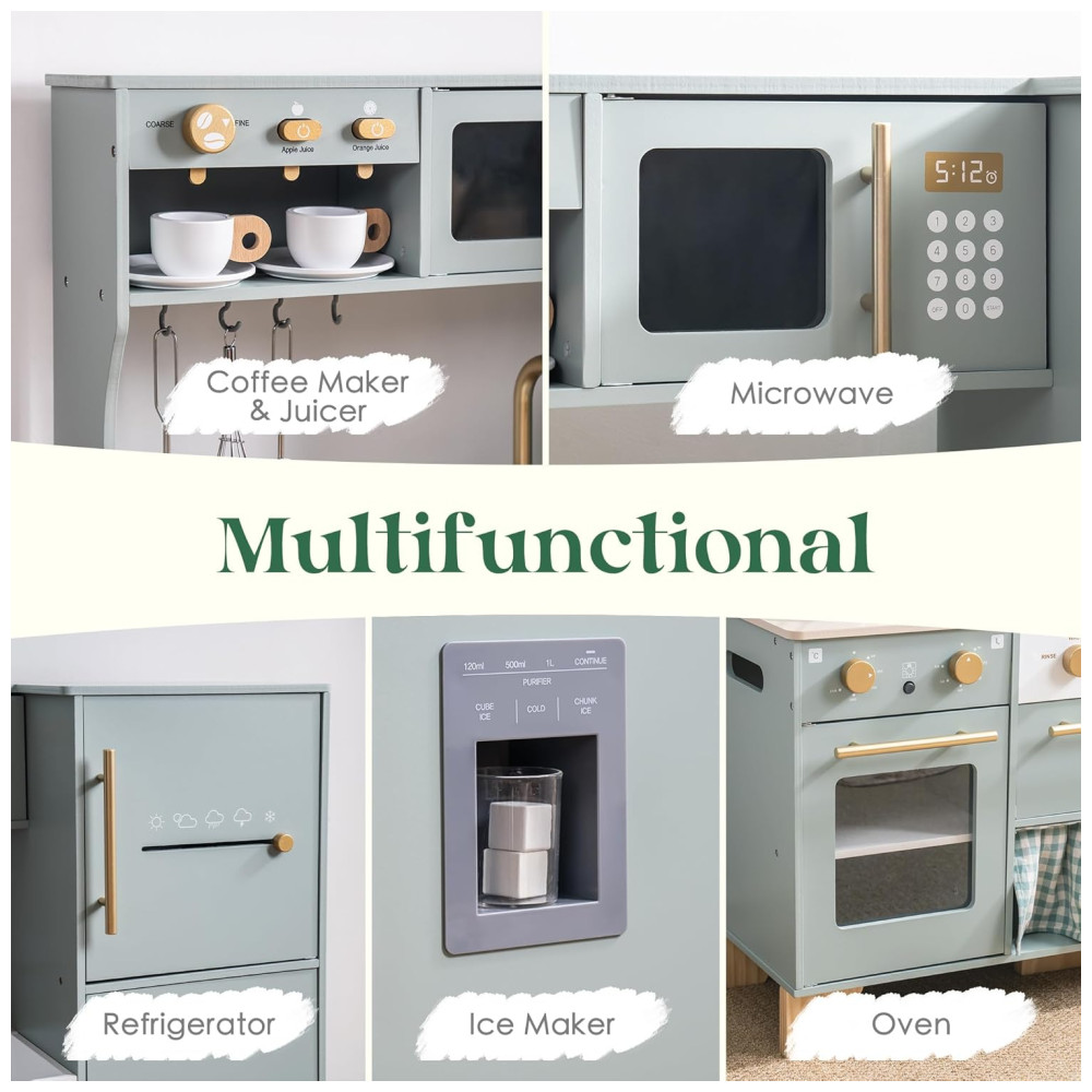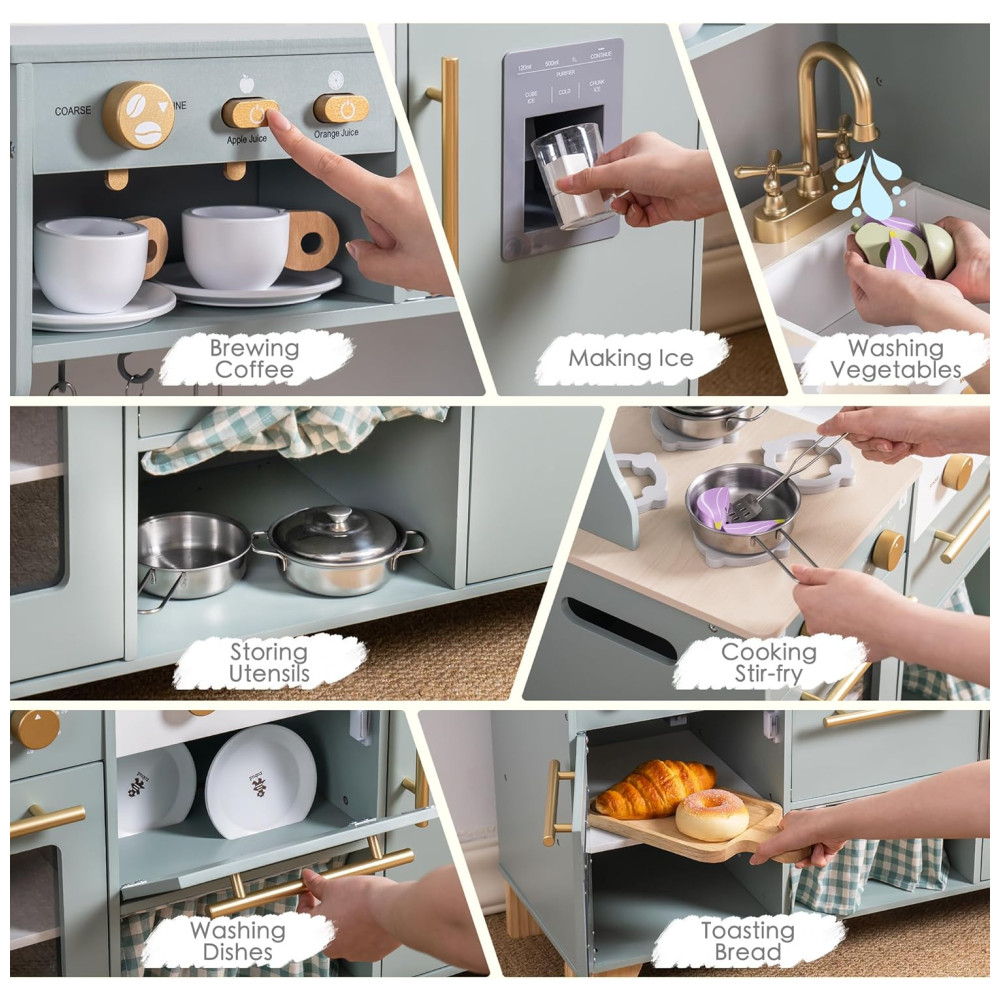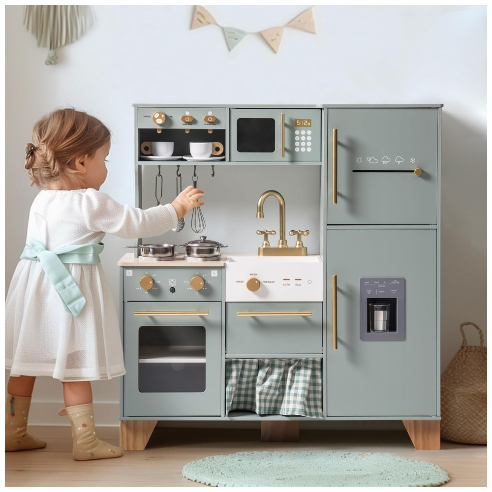 Crie um espaço de brincadeira requintado com esta cozinha de canto verde para crianças, com puxadores dourados e acessórios elegantes. As bordas suaves e utensílios leves e duráveis garantem a segurança das crianças. Todos os produtos e acessórios possuem superfícies lisas e sem rebarbas, permitindo que as crianças brinquem felizes e em segurança. Projetada com pegas ocas dos dois lados, esta cozinha é fácil de mover e pode ser colocada em qualquer lugar da casa. Com recursos diversificados que incluem geladeira, fabricador de gelo, cafeteira, espremedor, micro-ondas, forno, lava-louças e uma variedade de utensílios e xícaras de café, esta cozinha se torna um centro de criatividade e diversão para as crianças! A qualidade excepcional é uma marca constante da marca ROBUD, refletindo seu compromisso com a excelência e a artesanía requintada. Cada detalhe é meticulosamente projetado e rigorosamente selecionado para garantir durabilidade e experiência do usuário ideais para nossos produtos. Apesar de possuir muitos recursos divertidos, este produto é super fácil de montar! As instruções simples e claras facilitam a montagem rápida, para que as crianças possam mergulhar rapidamente na brincadeira. Este conjunto de cozinha de brinquedo é um presente emocionante para qualquer ocasião! Seja para feriado, aniversário ou apenas porque sim, seu design fofo e encantador cativará as crianças, estimulando a imaginação e ajudando a criar momentos maravilhosos de diversão e brincadeira.