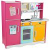 A cozinha infantil imita uma cozinha real com máquina de fazer gelo, telefone, fogão, pia e forno, além de botões rotativos que emitem sons de clique para maior diversão. O conjunto possui uma grande capacidade de armazenamento com várias áreas de armazenamento abertas e fechadas, incluindo um compartimento de tecido removível e uma prateleira para aumentar a flexibilidade de armazenamento.
