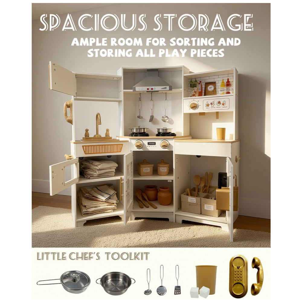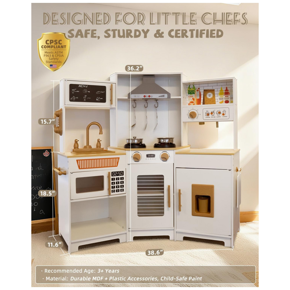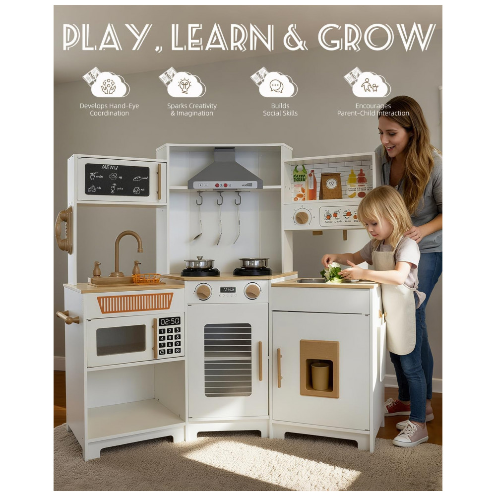 Tipo de produto: Cozinha infantil de brinquedo em madeira de canto com módulos eletrônicos