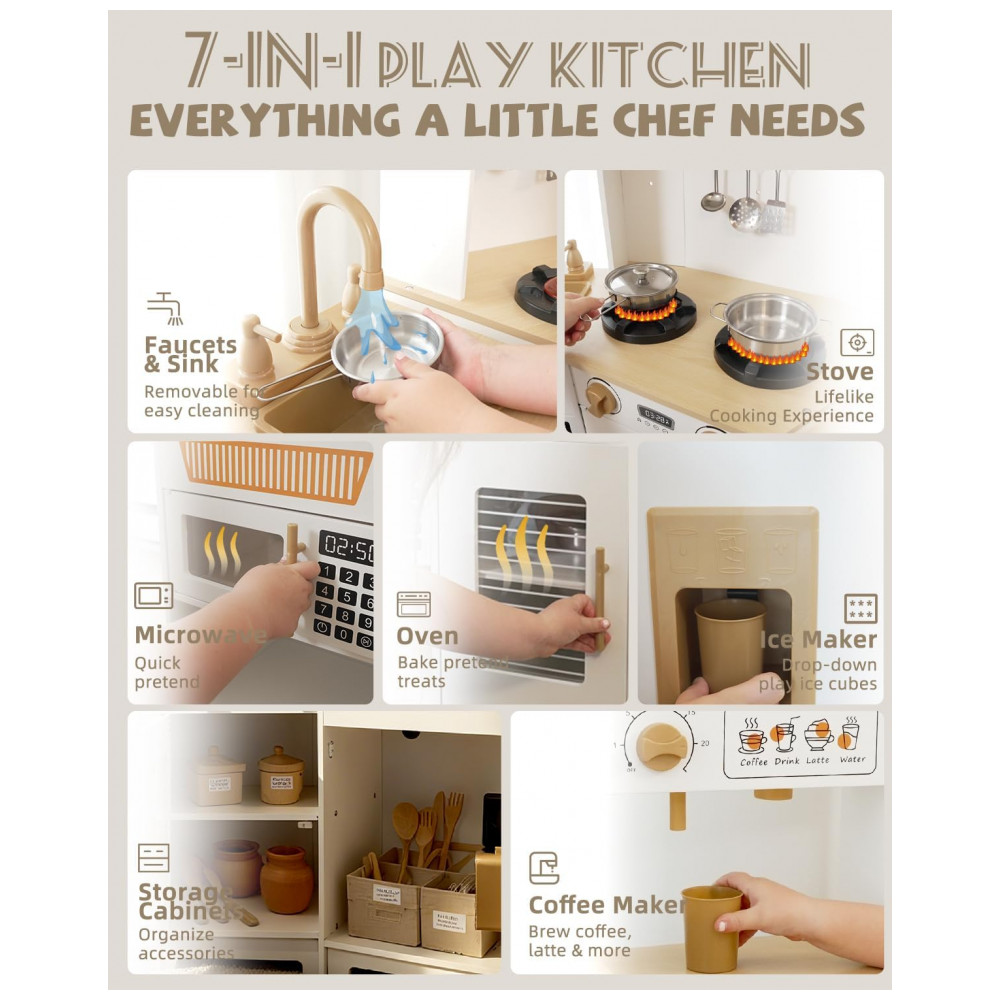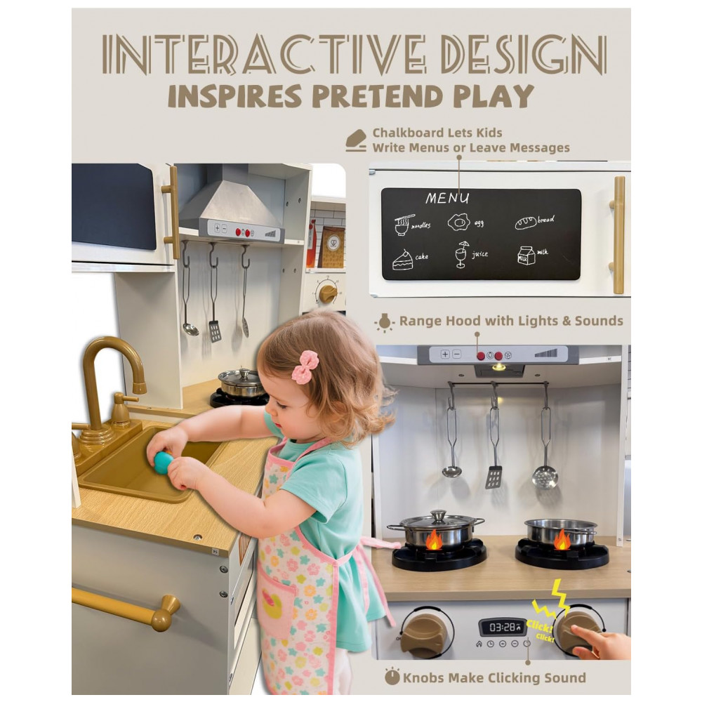 Os módulos eletrônicos incluem coifa com iluminação e efeitos sonoros, botões giratórios e detalhes que simulam funcionamento de eletrodomésticos. O conjunto acompanha panelas, frigideira e espátula de brinquedo, ampliando as possibilidades de preparo e organização de utensílios durante a brincadeira.