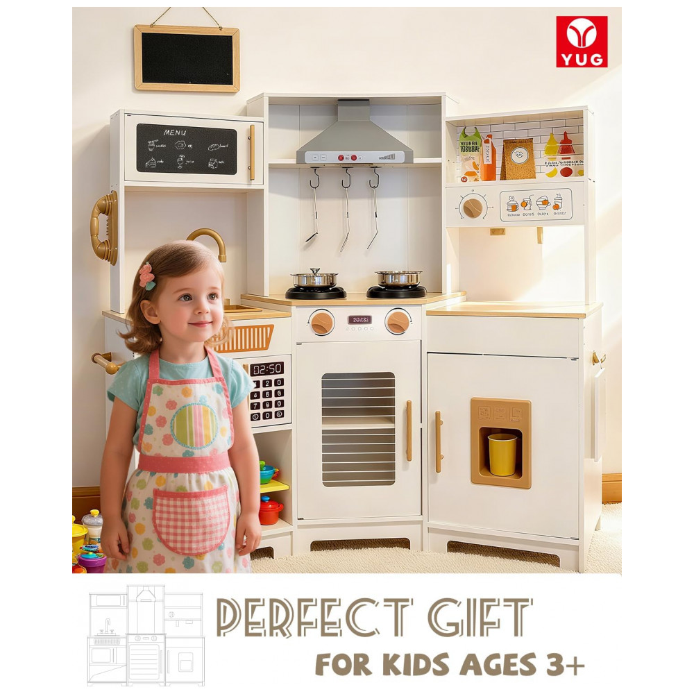 Cozinha infantil de canto YUG desenvolvida para crianças a partir de 3 anos, com layout em “L” que integra fogão, forno, micro-ondas, coifa, dispenser de gelo, pia removível e armários de armazenamento. A estrutura utiliza materiais atóxicos e é dimensionada para permitir que mais de uma criança brinque simultaneamente, favorecendo situações de faz de conta em ambiente de cozinha doméstica.