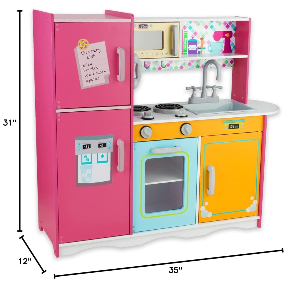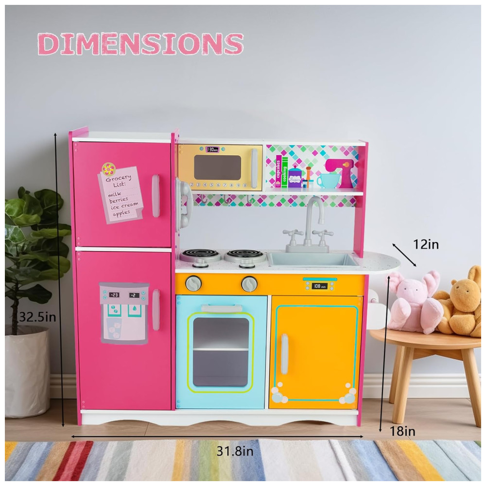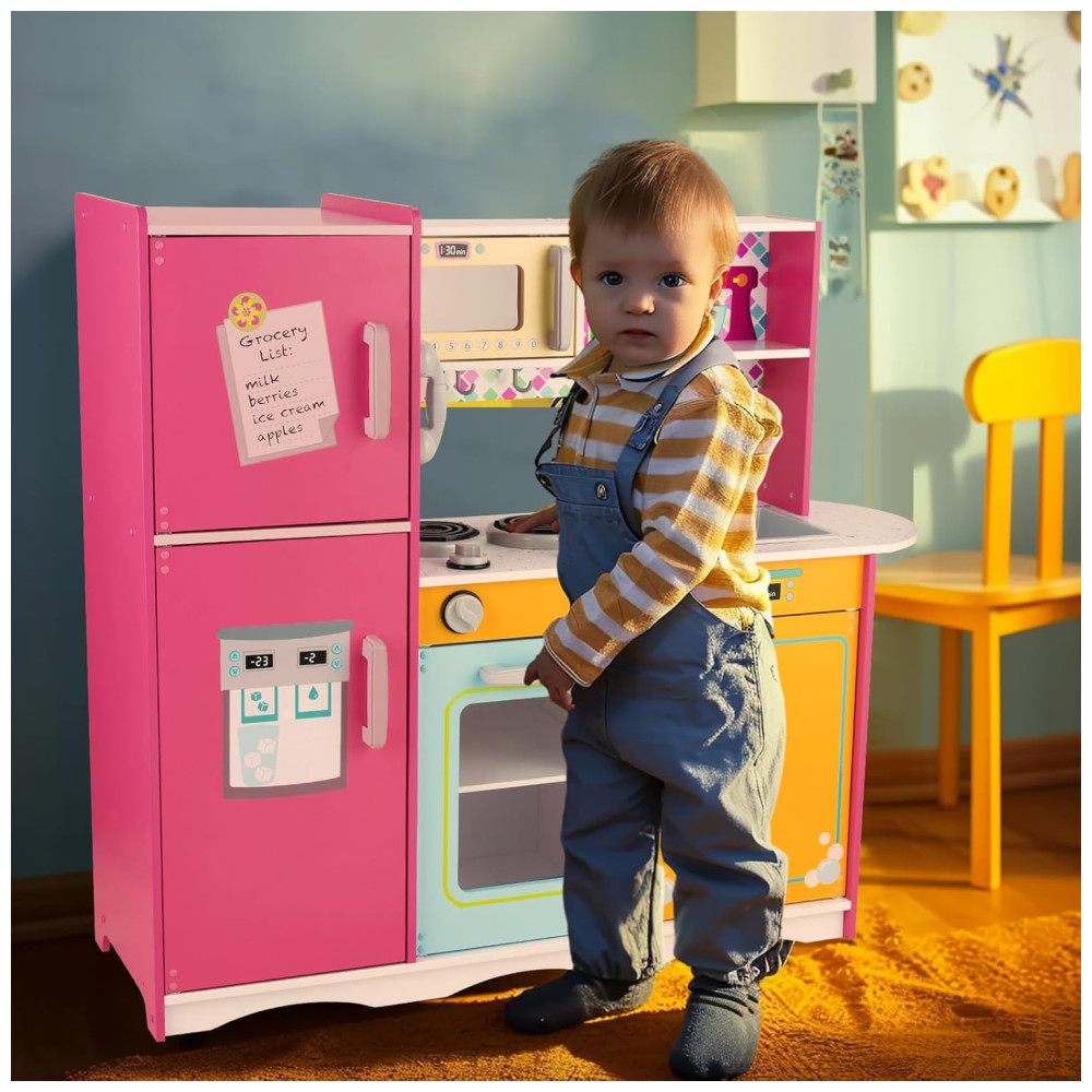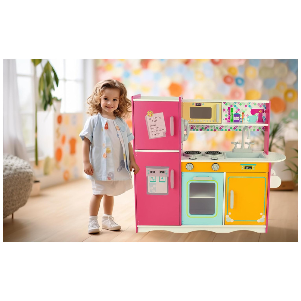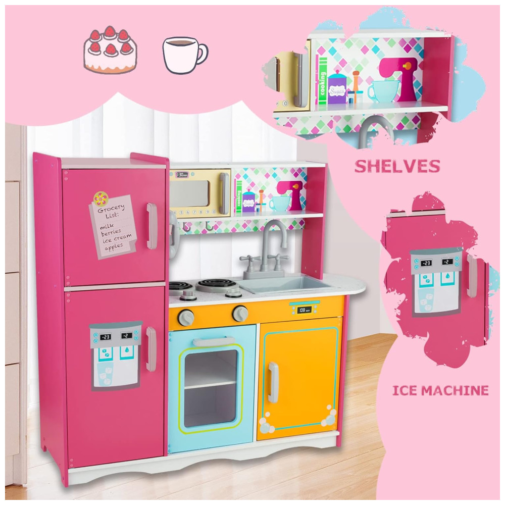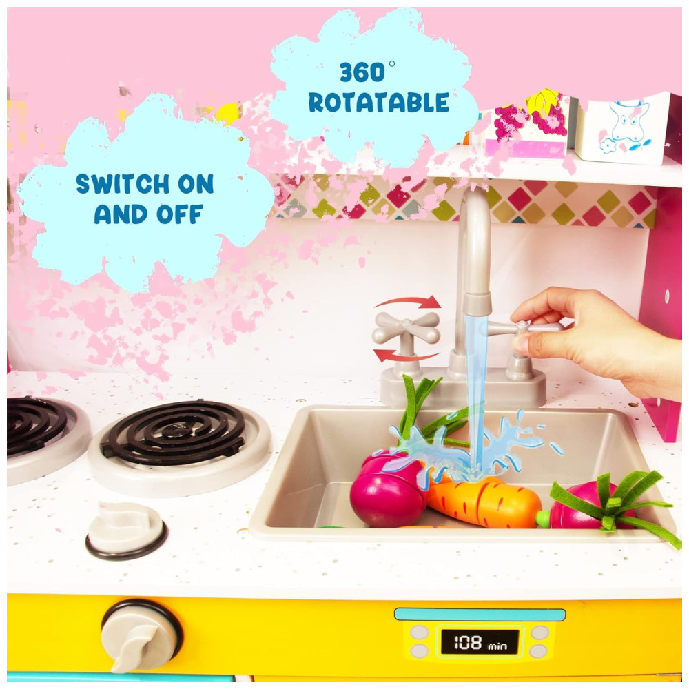 Cozinha Infantil de Madeira com Telefone Torneira e Pia Realistas para Crianças de 3 a 8 Anos WoodenEdu Amarela e Rosa