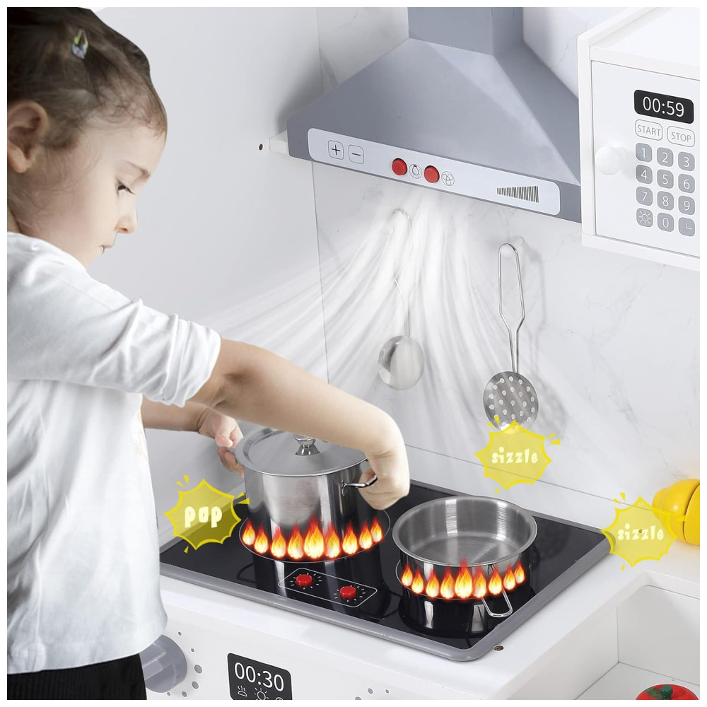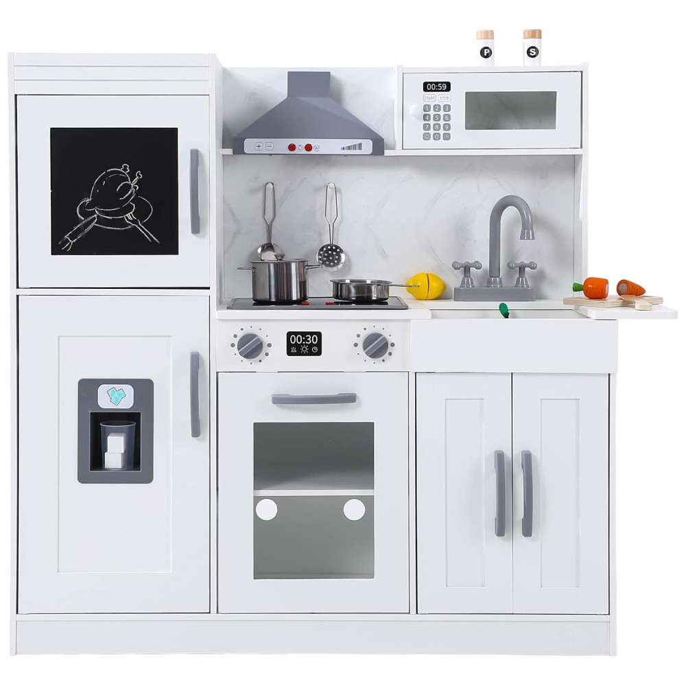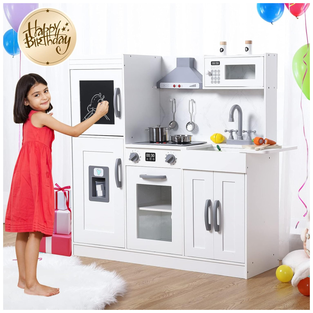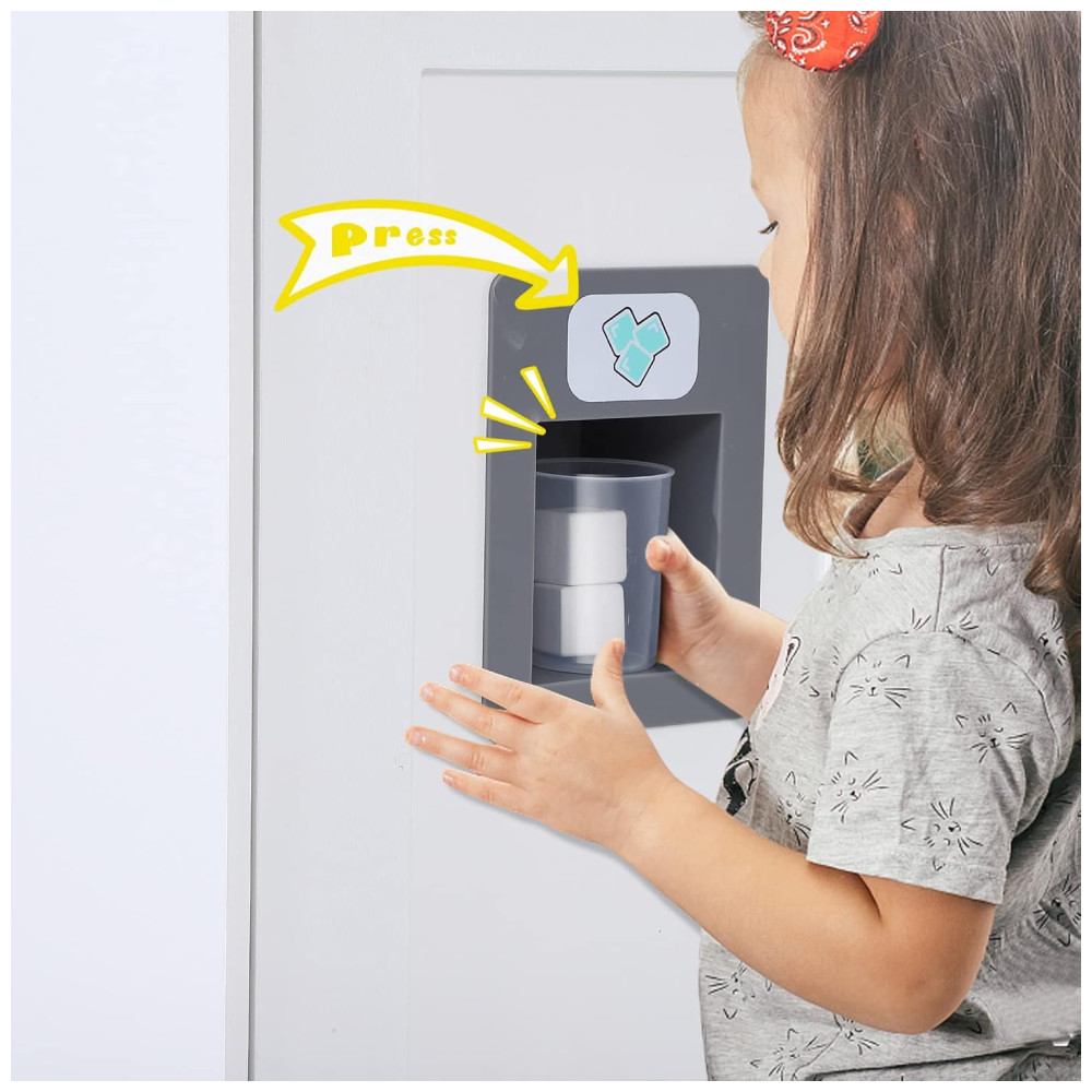 Com funções realistas, como o botão do fogão e do exaustor que acendem e emitem som de cozimento, e o botão da máquina de fazer gelo que faz os cubos caírem, as crianças se divertirão muito com este conjunto. Além disso, o quadro negro ajuda a gravar receitas e o conjunto inclui um forno, micro ondas, torneira e pia.