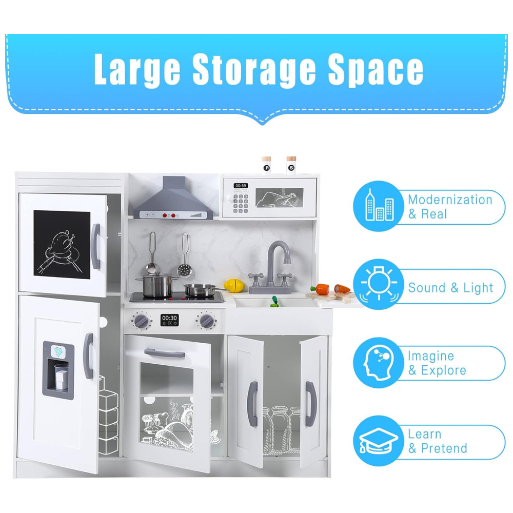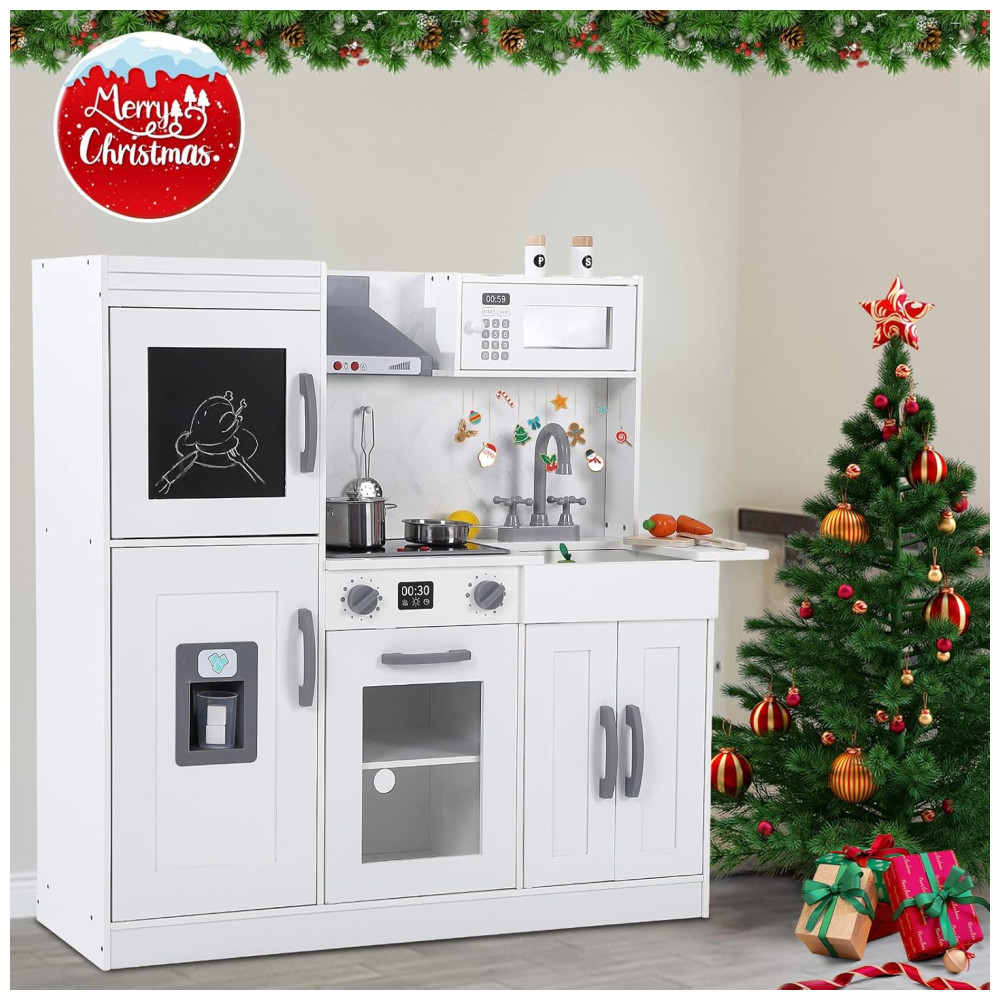 Cozinha Infantil em Madeira com 20 Acessórios Máquina de Gelo Micro-Ondas Forno Exaustor Pia Luzes e Sons Realistas Bophy Branca