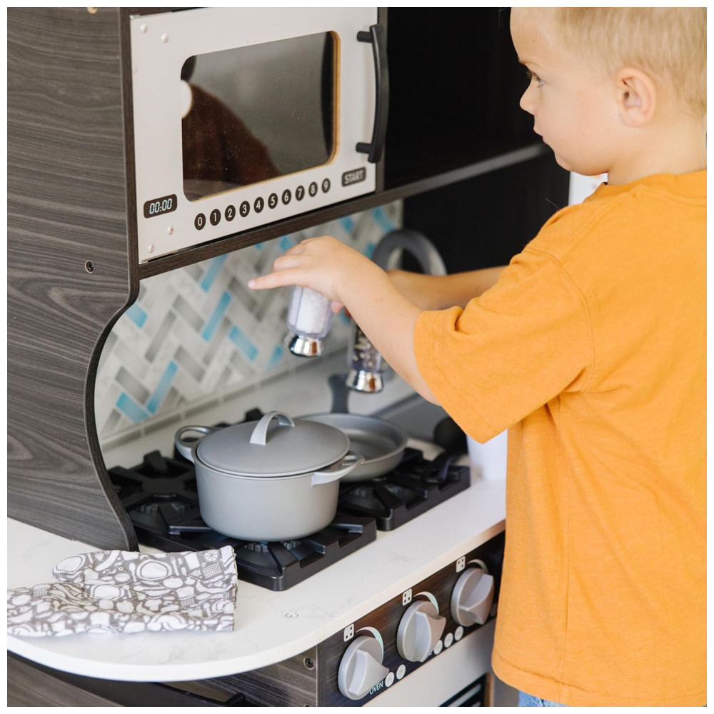 Esta cozinha de brinquedo é feita com mármore branco e madeira colorida, trazendo um toque moderno para a brincadeira. É espaçosa o suficiente para várias crianças brincarem ao mesmo tempo e inclui forno, fogão, micro ondas, pia, geladeira com dispensador de gelo funcional, freezer e amplo espaço de armazenamento para fácil limpeza.
