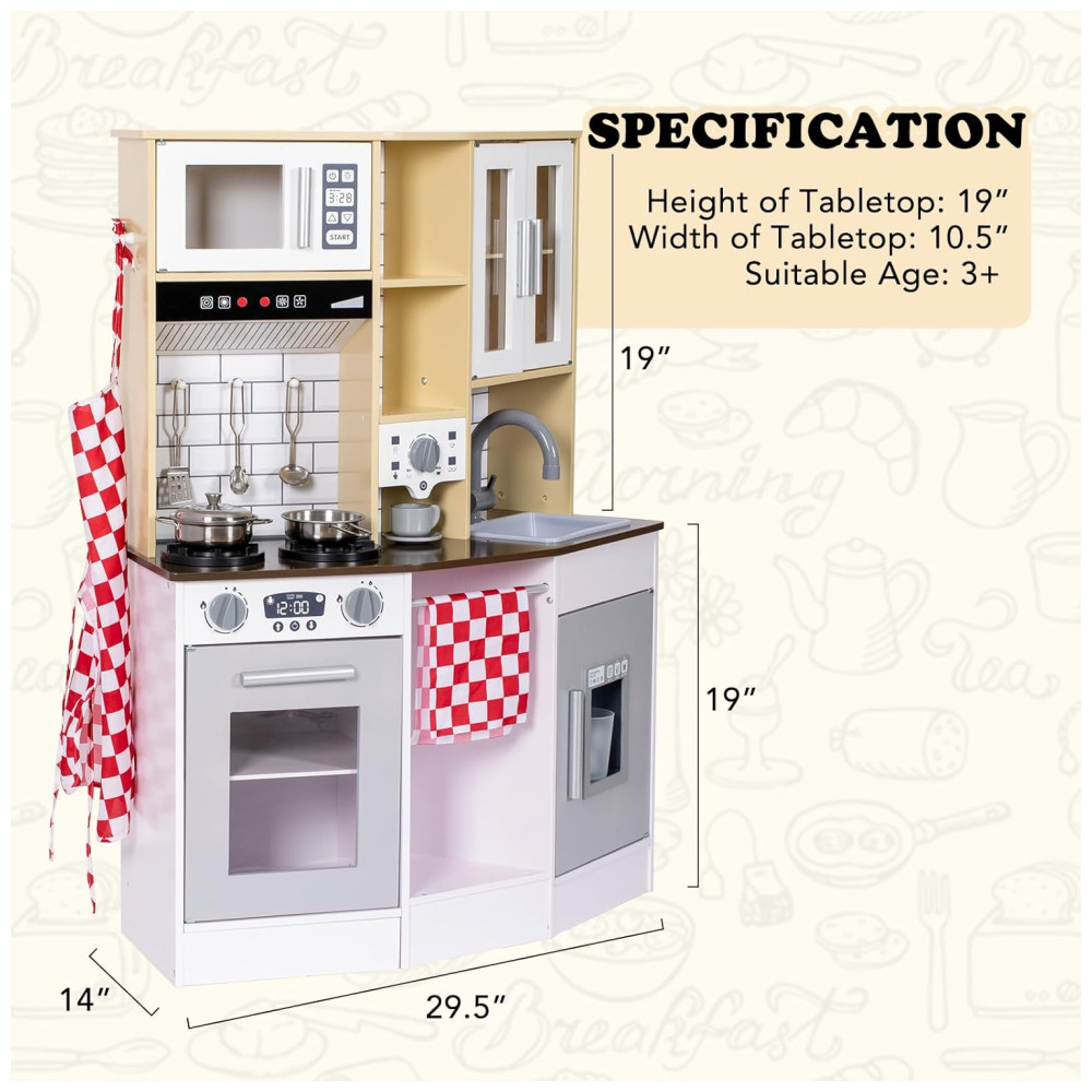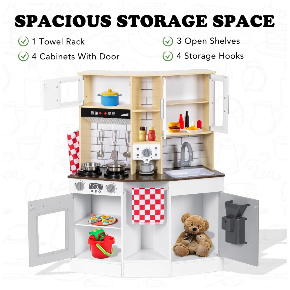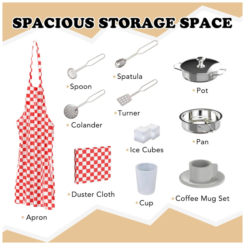 Feito com MDF premium, este conjunto de cozinha infantil é resistente e durável, com bordas arredondadas e pintura adequada para crianças para garantir segurança completa. Este conjunto de cozinha infantil oferece espaço suficiente para guardar todos os acessórios após o término da brincadeira, com armários e prateleiras para organização. Com avental e toalha inclusos, as crianças podem aprender a cozinhar e limpar enquanto se divertem.