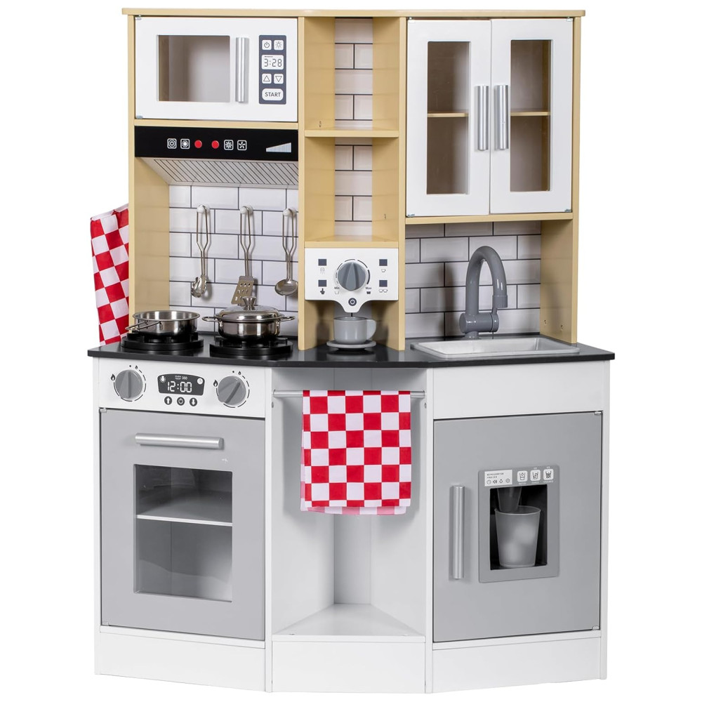 Cozinha Infantil em Madeira com Pia Torneira Forno Micro-ondas e Acessórios para Crianças Acima de 3 Anos Brinjoy Branca