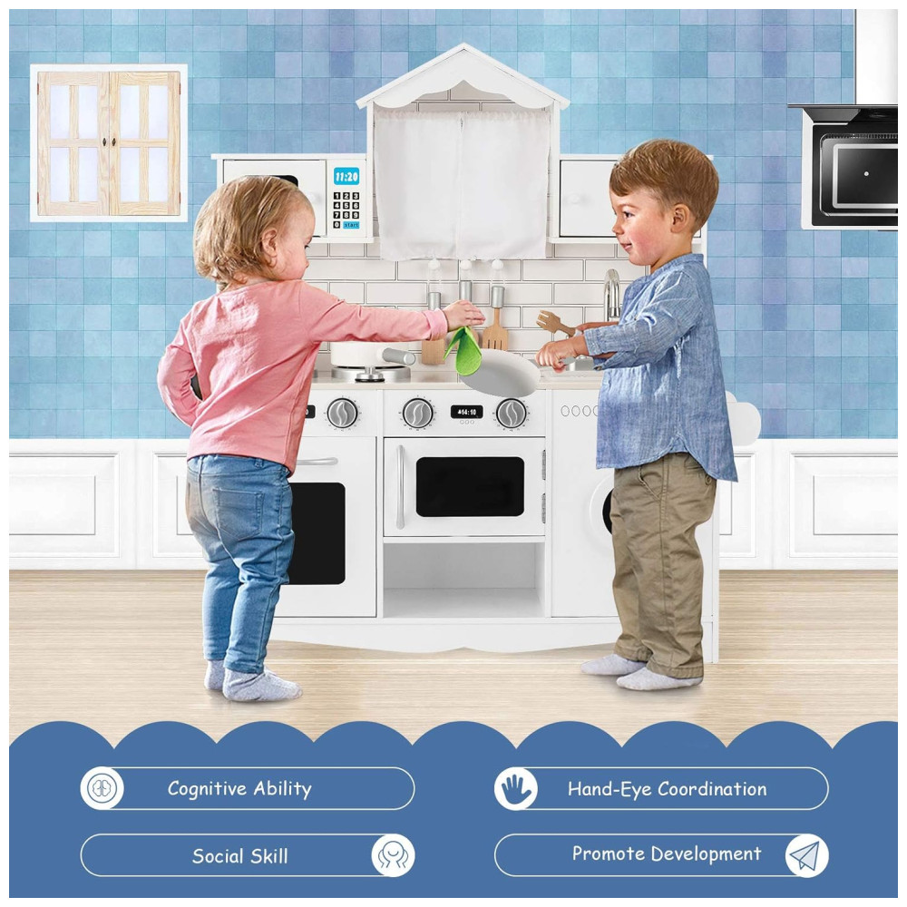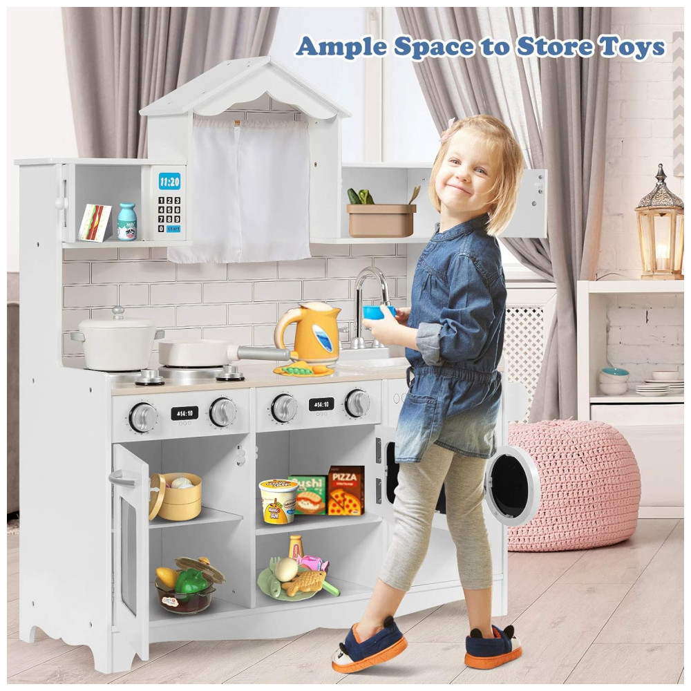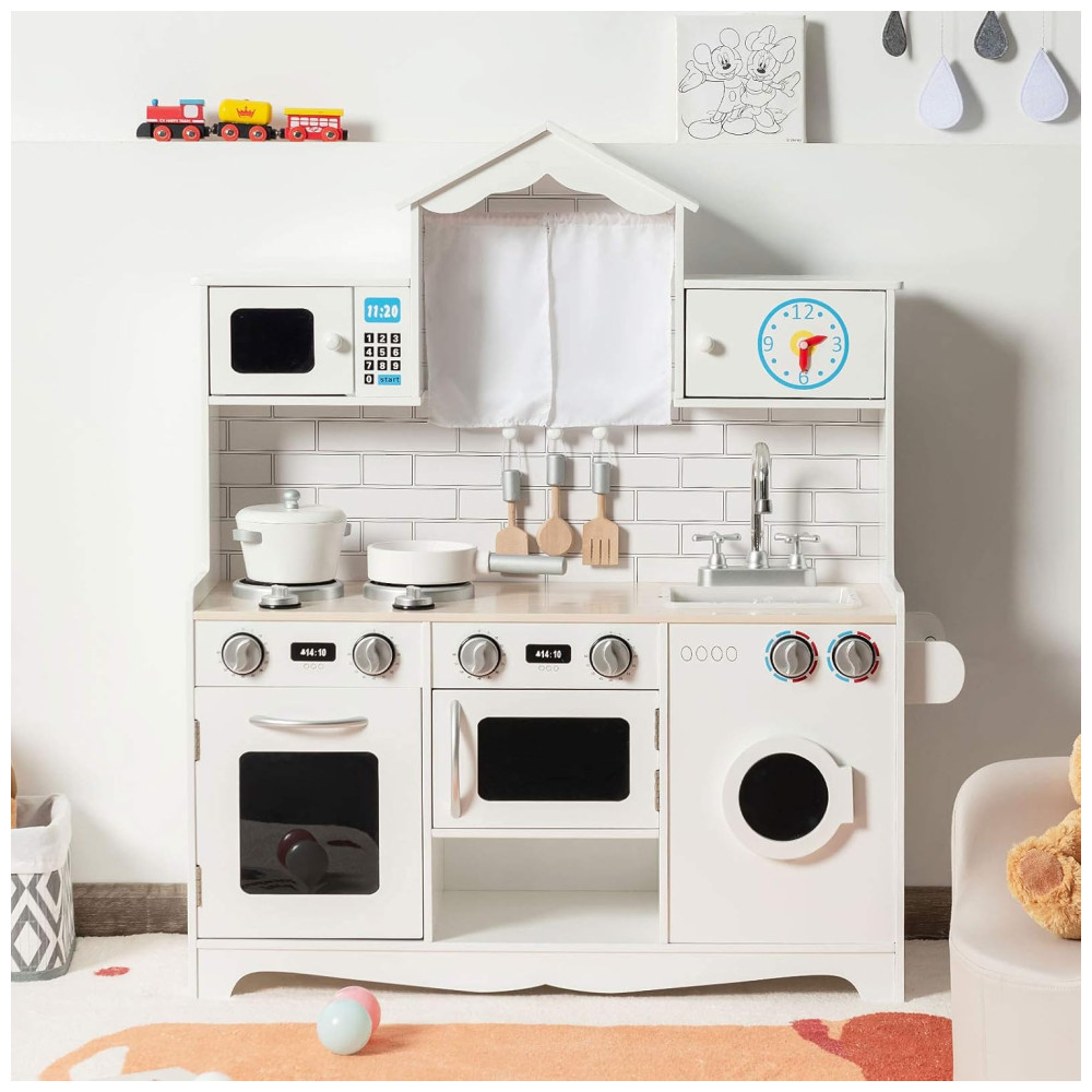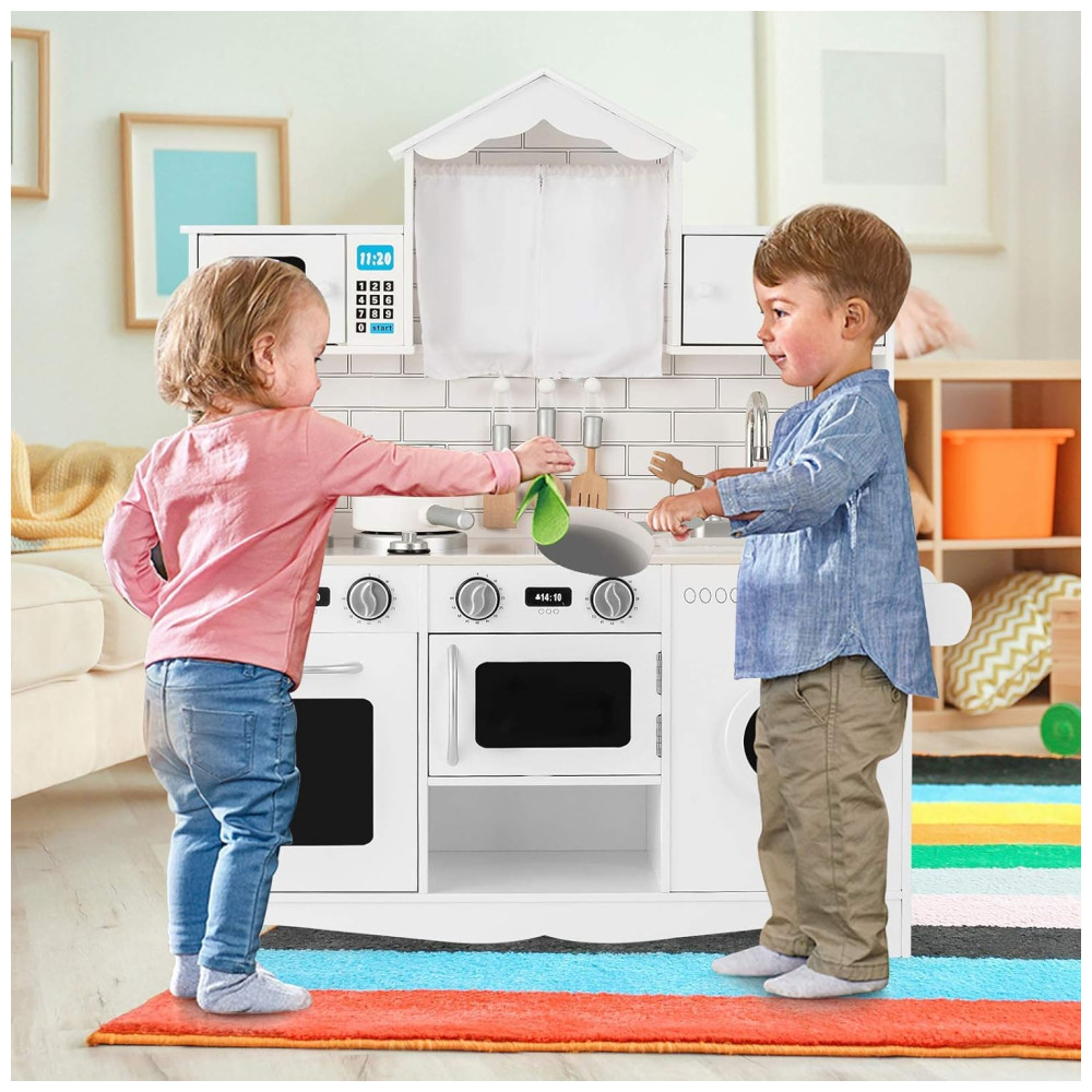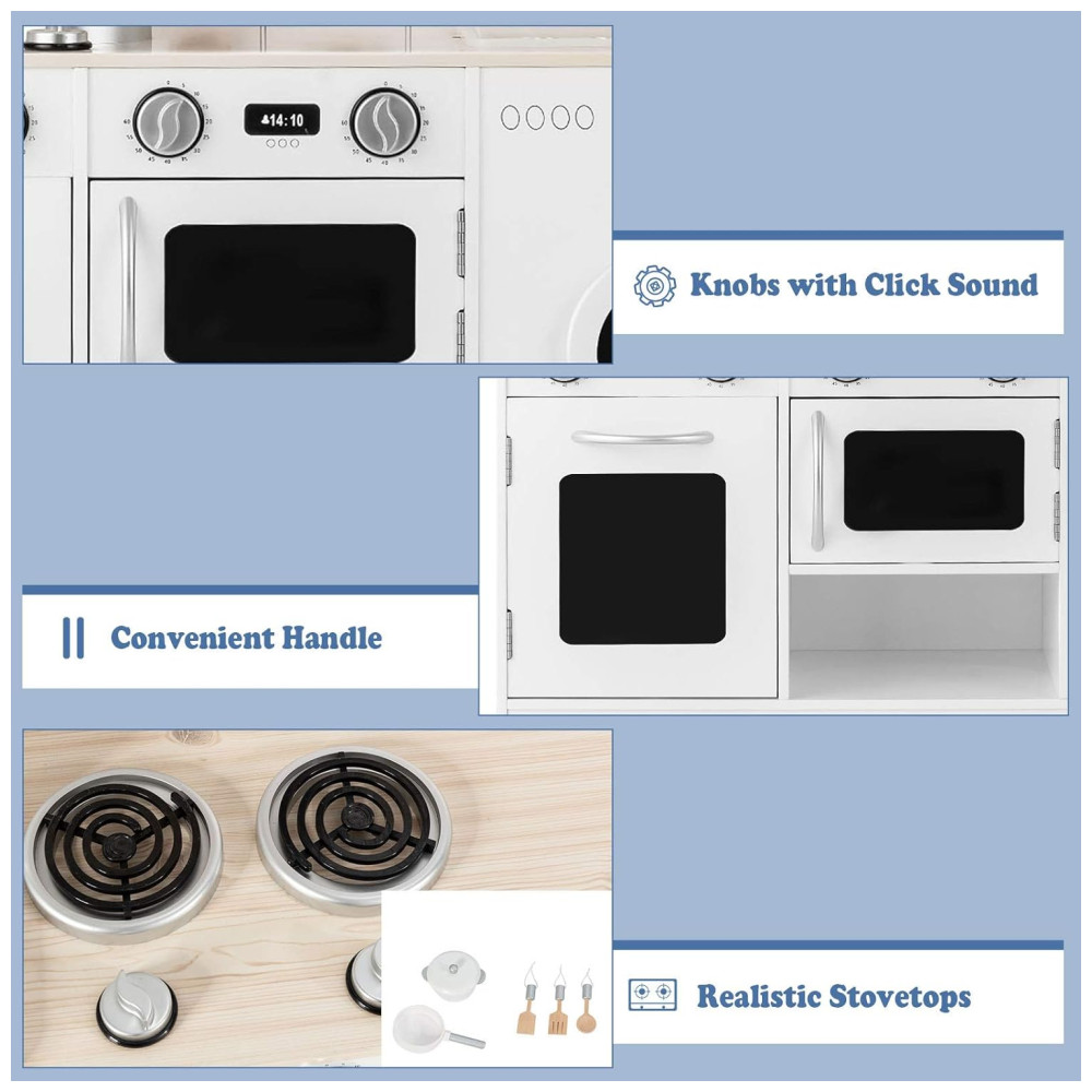 Cozinha Infantil em Madeira com Som Realista Micro-ondas e Janelas para Crianças Acima de 3 Anos Costzon Branca
