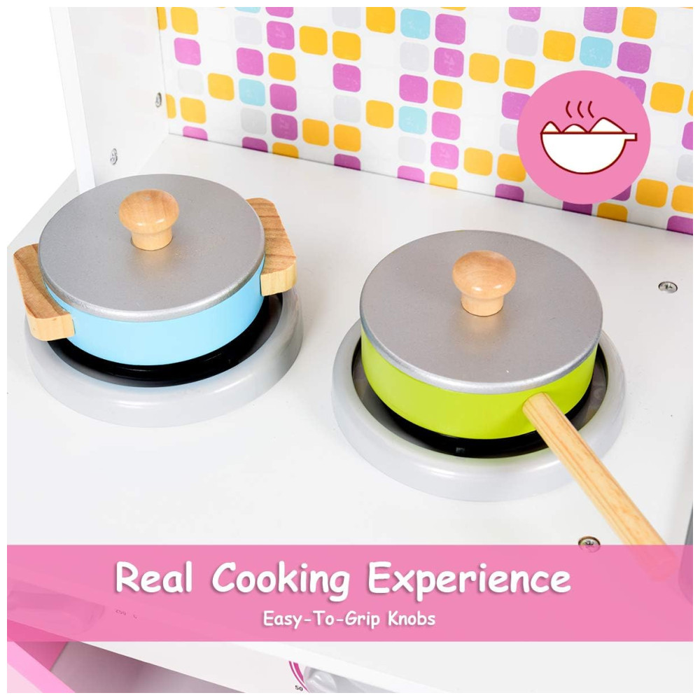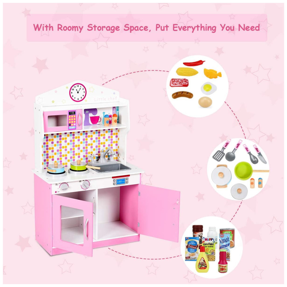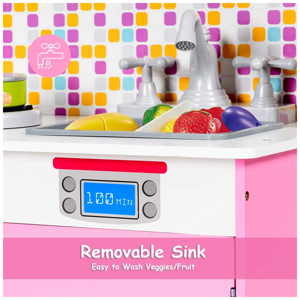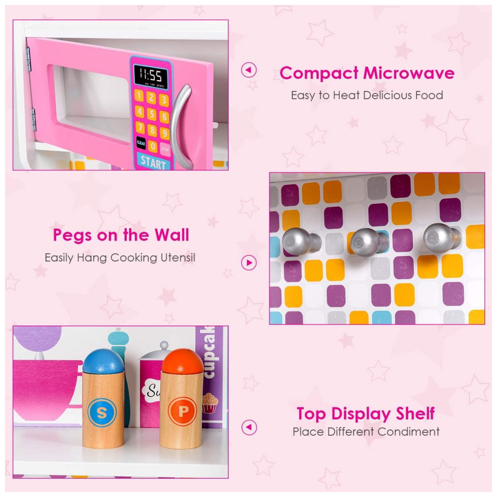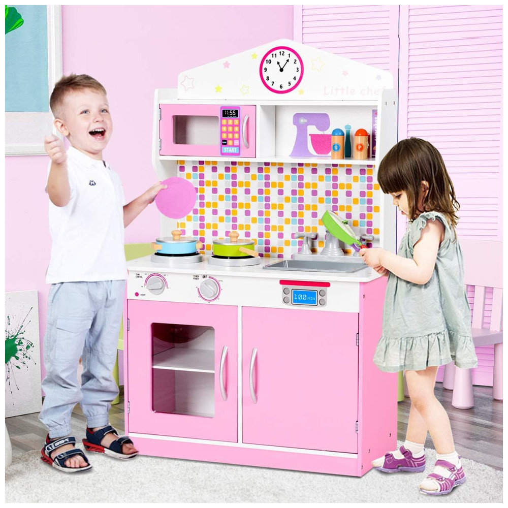 Cozinha Infantil em Madeira com Som Realista Micro-ondas Frigideira e Acessórios Costzon Rosa