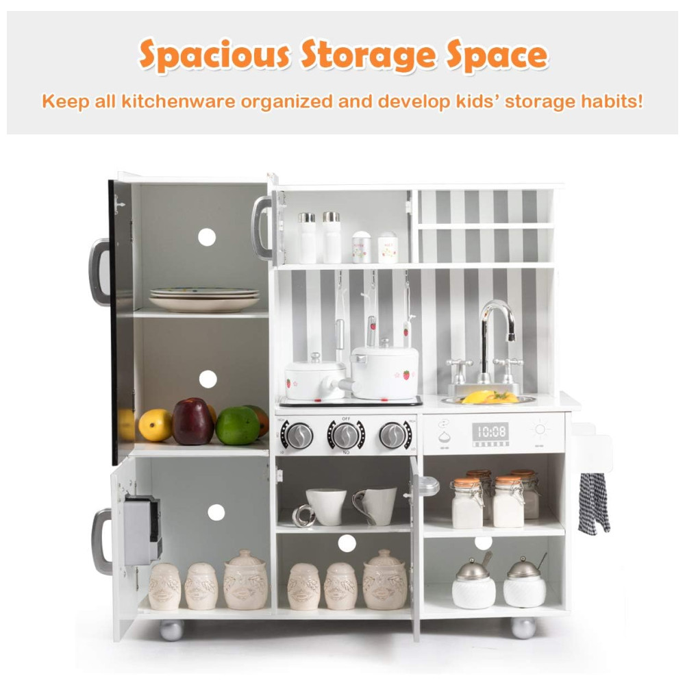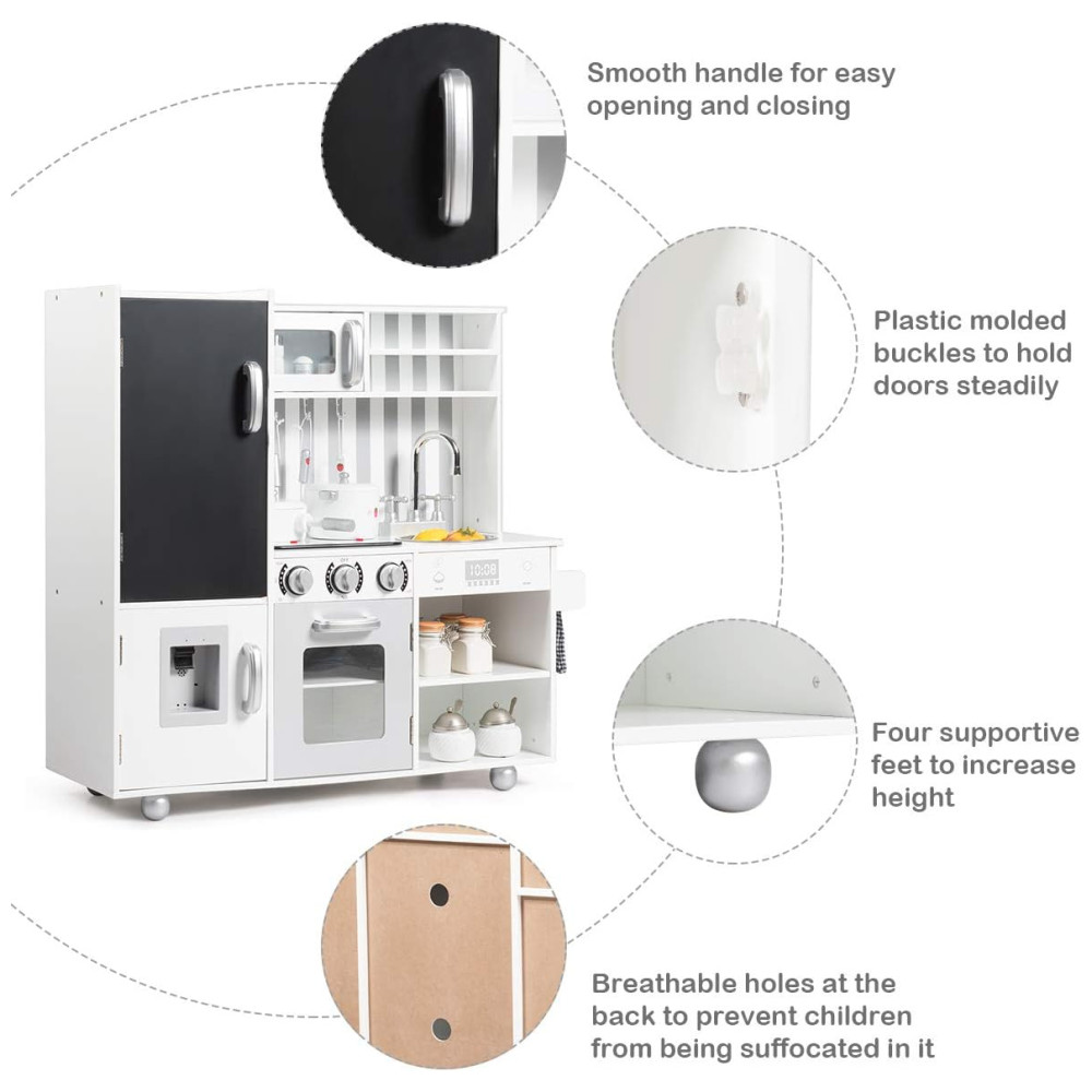 As prateleiras abertas de 2 camadas são perfeitas para colocar utensílios de cozinha, e há muito espaço no forno, micro ondas, geladeira e máquina de fazer gelo, que pode exercitar a capacidade de classificação e organização das crianças. Com tanto espaço de armazenamento, as crianças não vão bagunçar o conjunto da cozinha durante o entretenimento.