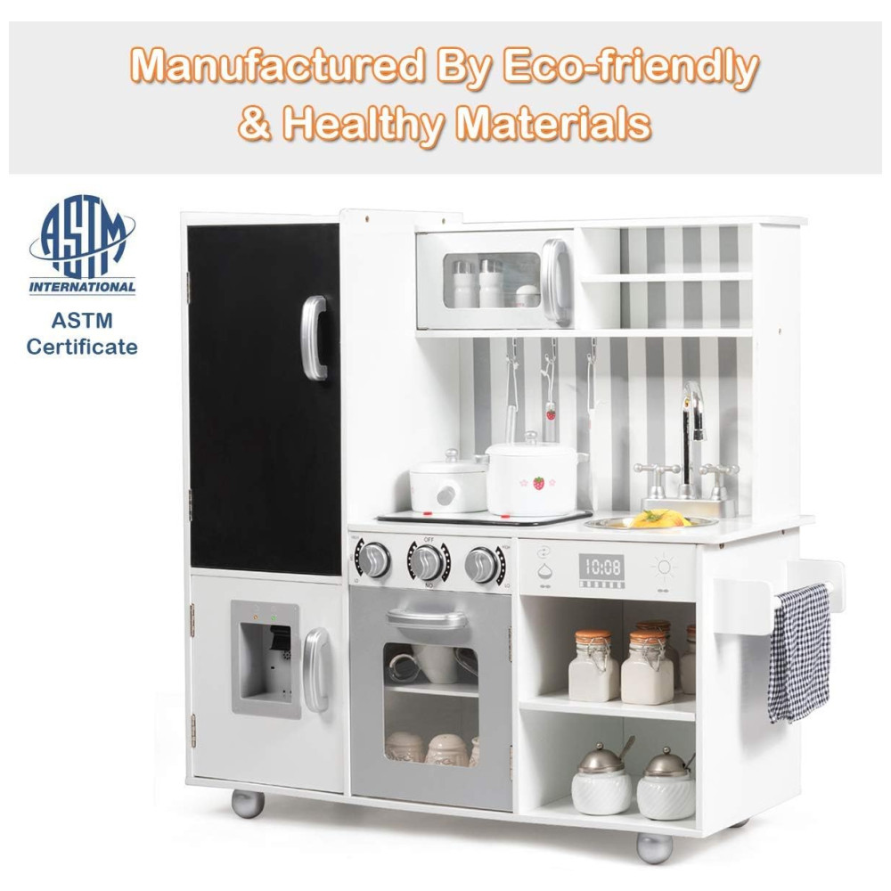 Fabricado com materiais premium para uma estrutura estável e durável, este brinquedo educativo para cozinha é avaliado como um produto de alta qualidade que passou no padrão ASTM. Todos os materiais são inodoros, para que as crianças possam aproveitar o tempo na cozinha imediatamente após a montagem.