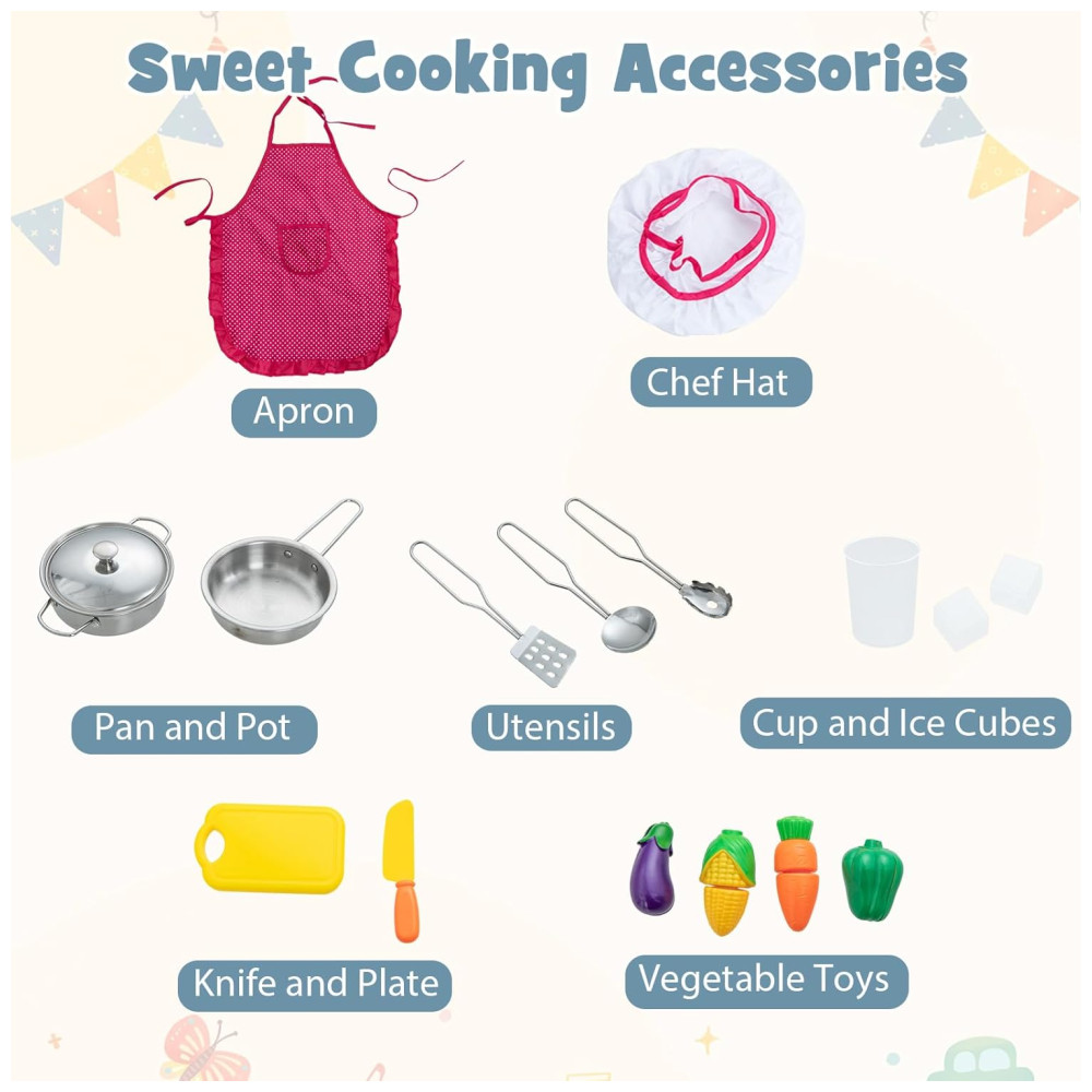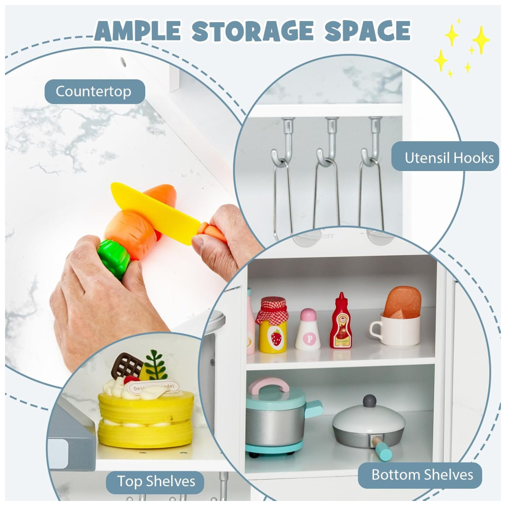 O conjunto possui muito espaço de armazenamento, com um gancho no lado esquerdo para pendurar chapéu ou avental de chef infantil, 3 ganchos para utensílios, uma prateleira superior e 2 prateleiras abertas para diferentes alimentos para brincar. Este conjunto de cozinha é uma escolha de presente perfeita para aniversários de crianças, Natal ou outros festivais, ajudando as crianças a desenvolver habilidades para a vida, habilidade prática e coordenação olho mão.