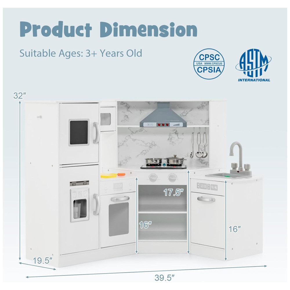 Este conjunto de cozinha infantil em formato de canto vem com um lavatório separado equipado com sistema de circulação de água. A torneira giratória e a pia removível permitem que as crianças finjam que estão lavando vegetais, e a torneira apresenta sons e luzes realistas. Além disso, o micro ondas, o exaustor e os fogões podem emitir sons e luz reais, tornando a brincadeira mais realista. O vapor sairá dos fogões assim que você adicionar água no botão azul.