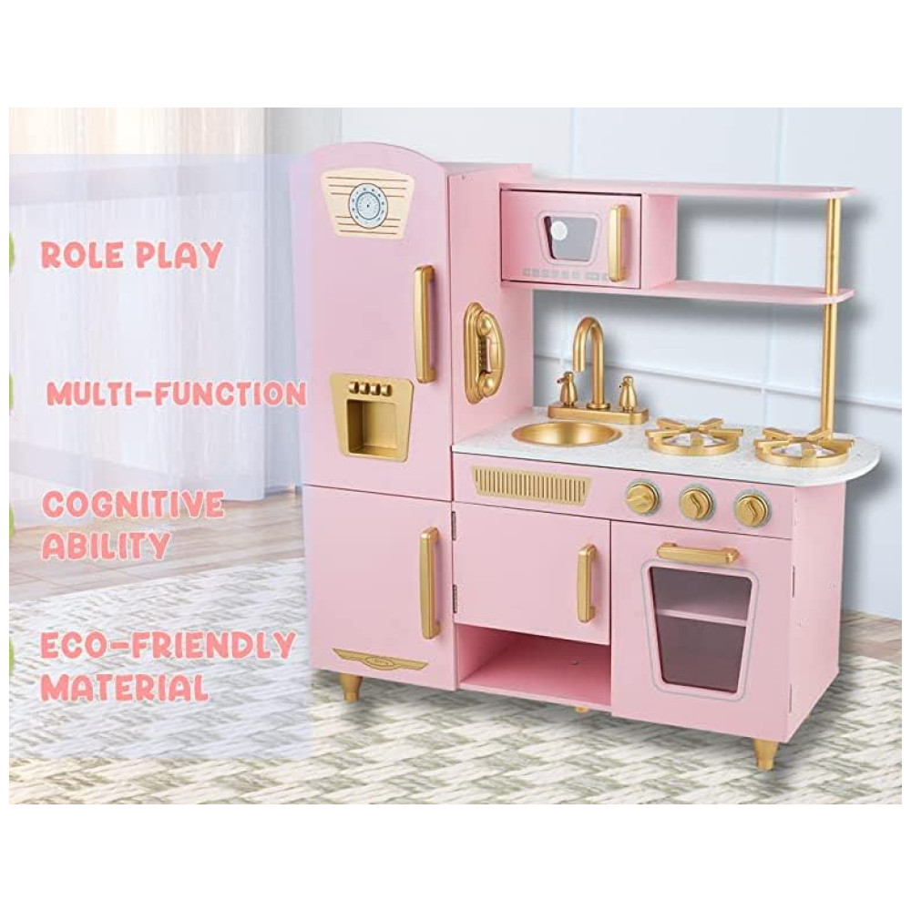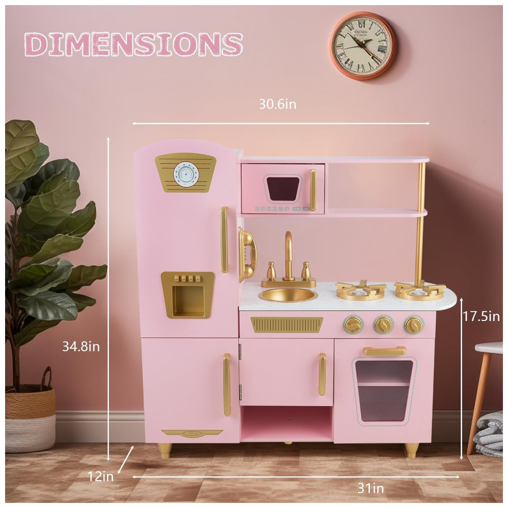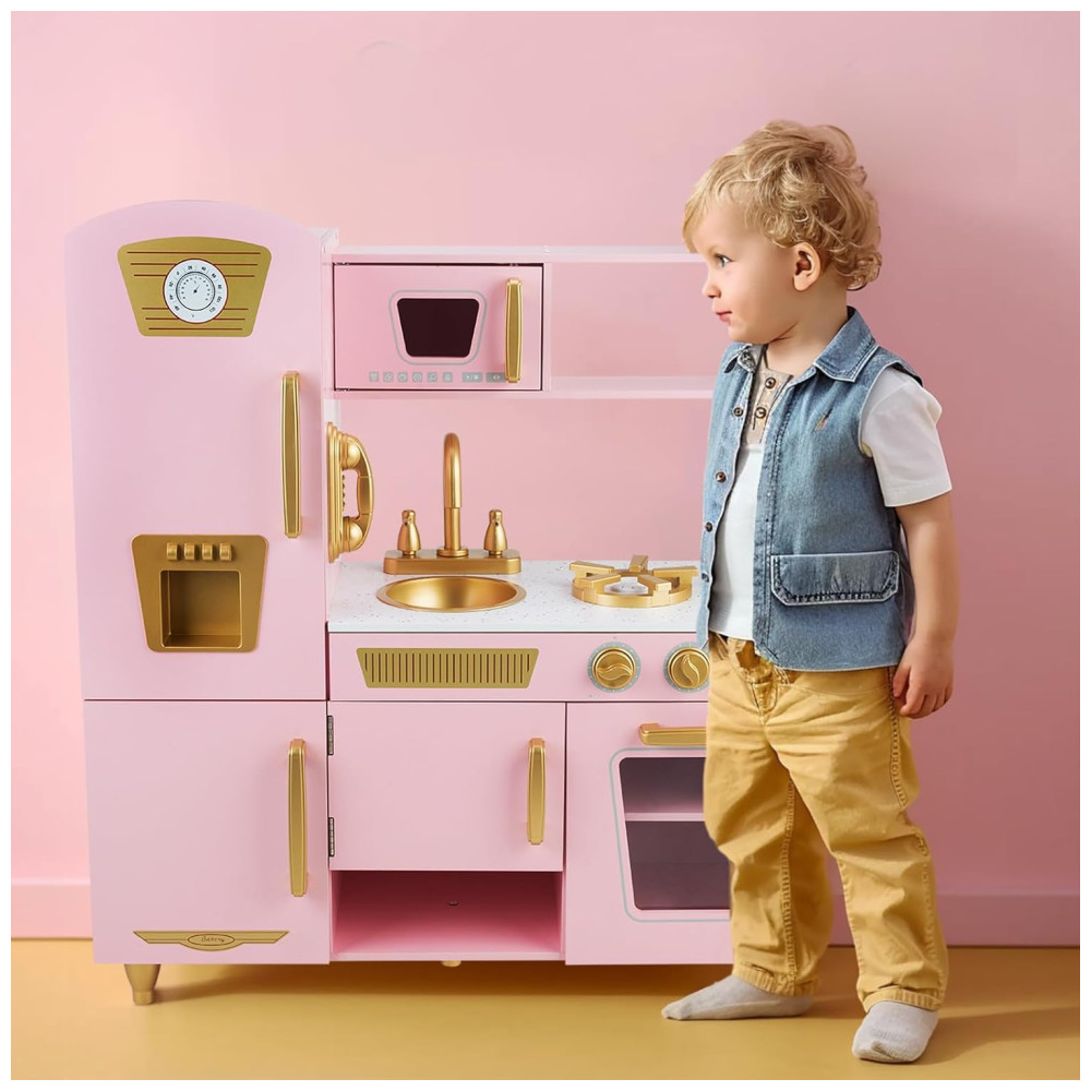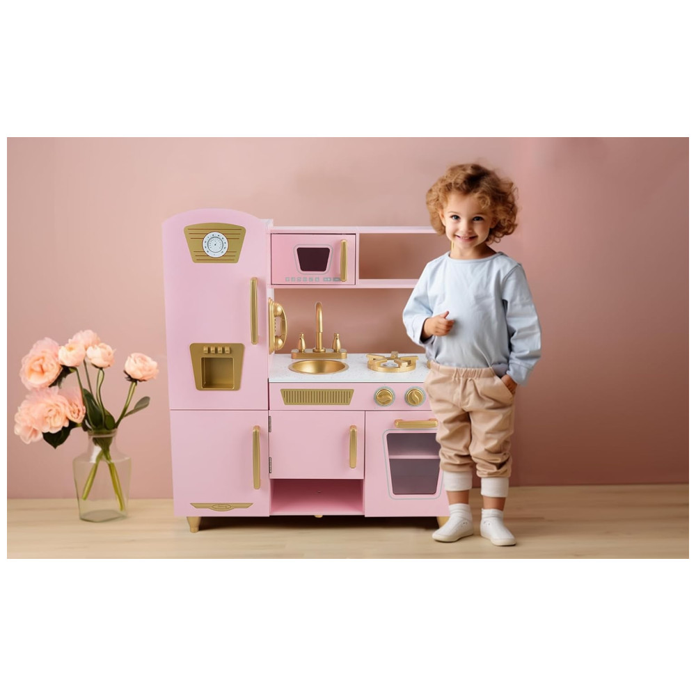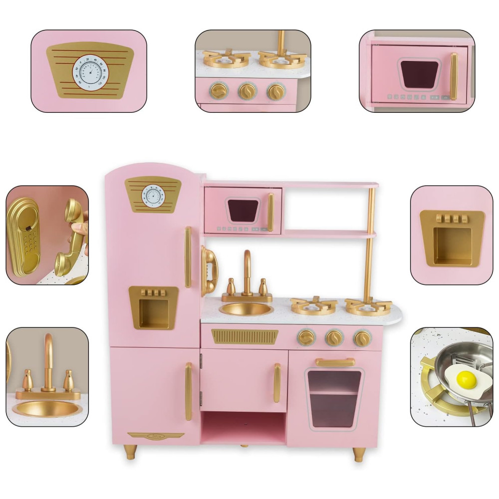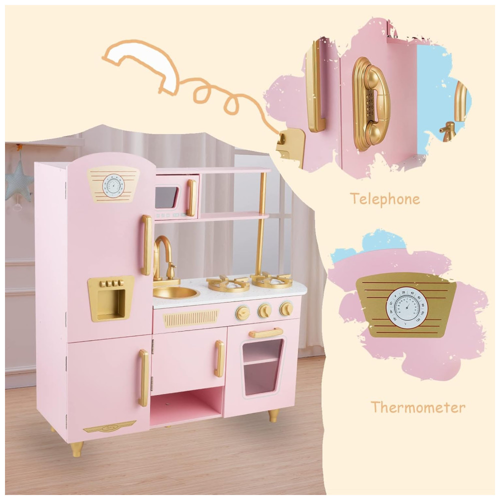 Cozinha Infantil em Madeira com Telefone Micro-Ondas Geladeira Torneira e Pia Realistas para Crianças Acima de 3 Anos WoodenEdu Rosa