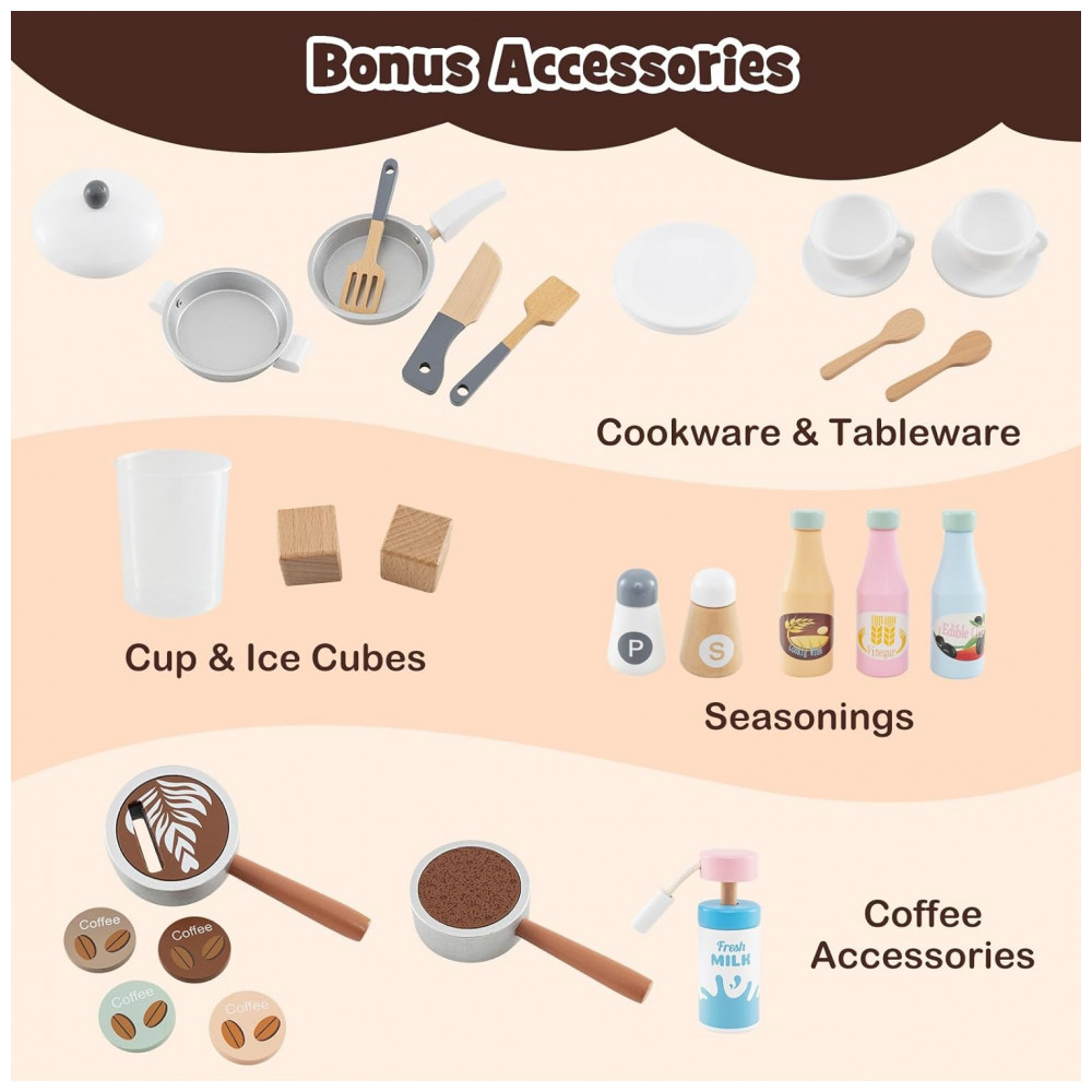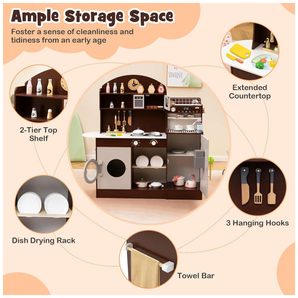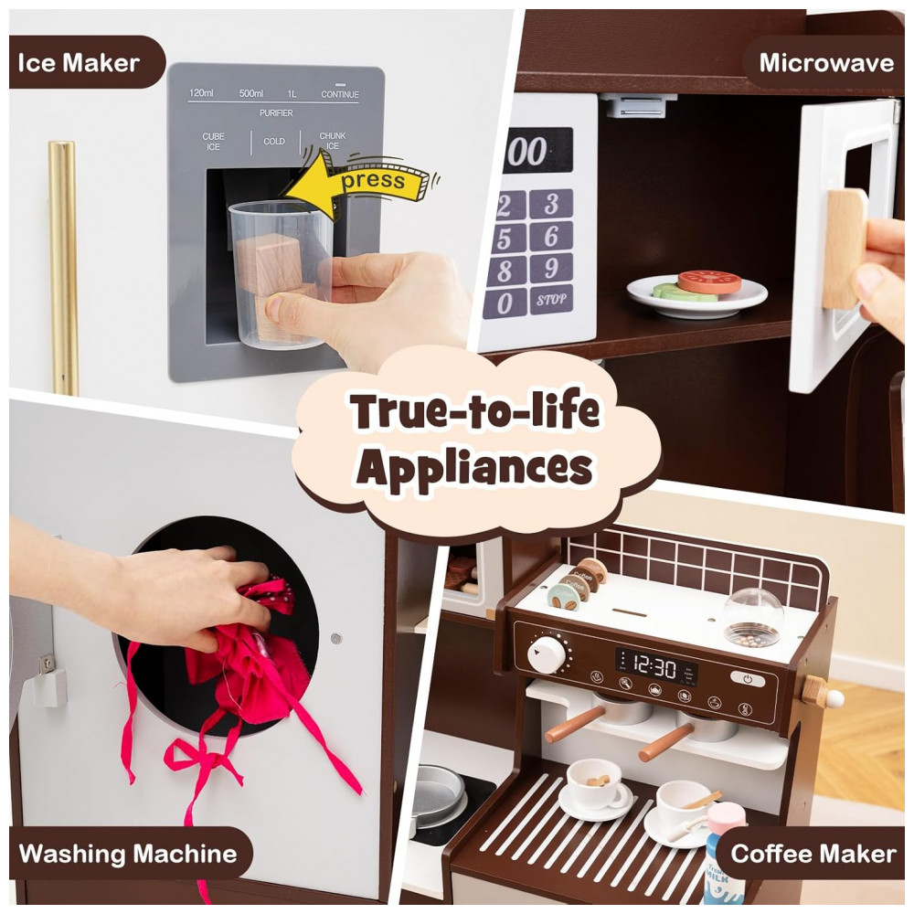 O conjunto oferece uma experiência de cozinha realista, com eletrodomésticos de mentira, botão clicável do fogão e forno para cozinhar ingredientes de mentira, torneira, pia removível, toalheiro, toalha e outros gadgets. Possui ainda grande espaço de armazenamento, com porta embaixo da pia e espaço no forno para guardar alimentos ou utensílios de cozinha.