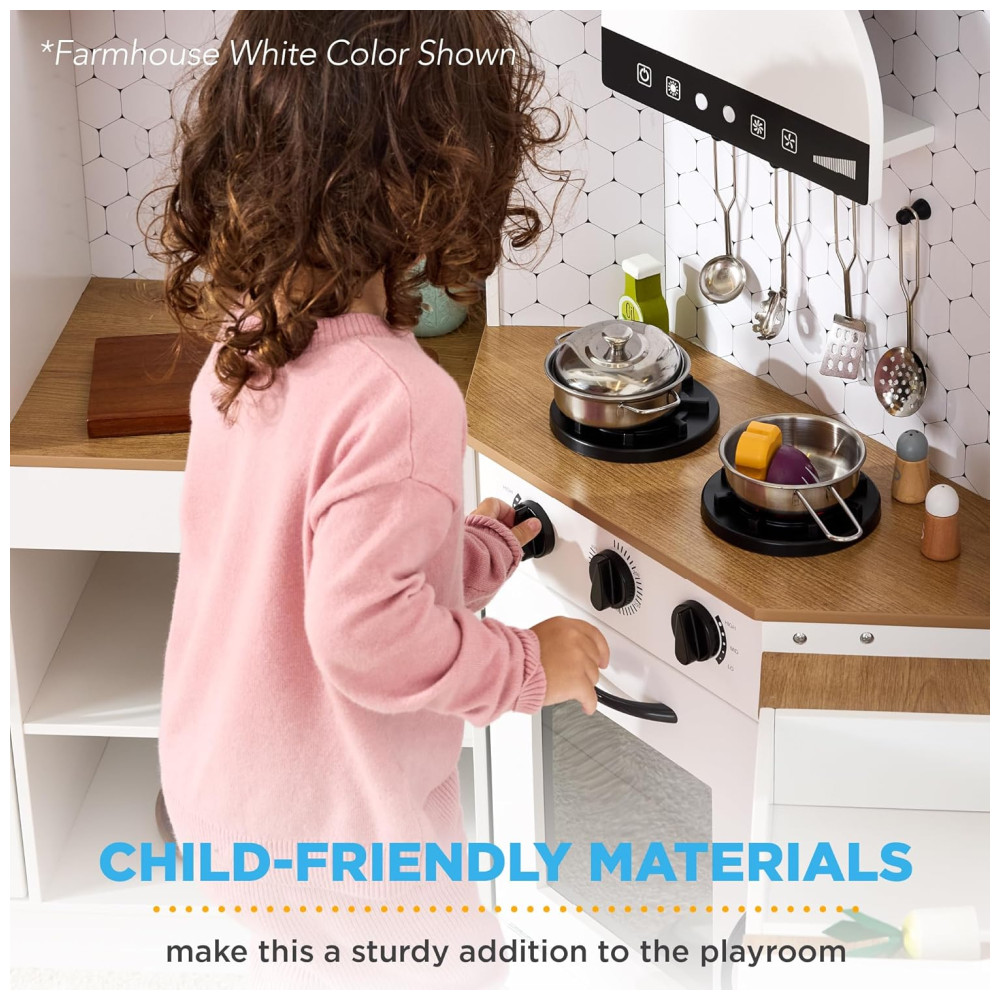 Este conjunto de jogos de cozinha é perfeito para as aventuras imaginativas de seus filhos. Com elementos interativos como um forno, pia, exaustor iluminado por bateria e máquina de fazer gelo correspondente, seu filho pode fingir que está cozinhando e assando em um espaço de recreação durável e confiável feito de MDF e metal.