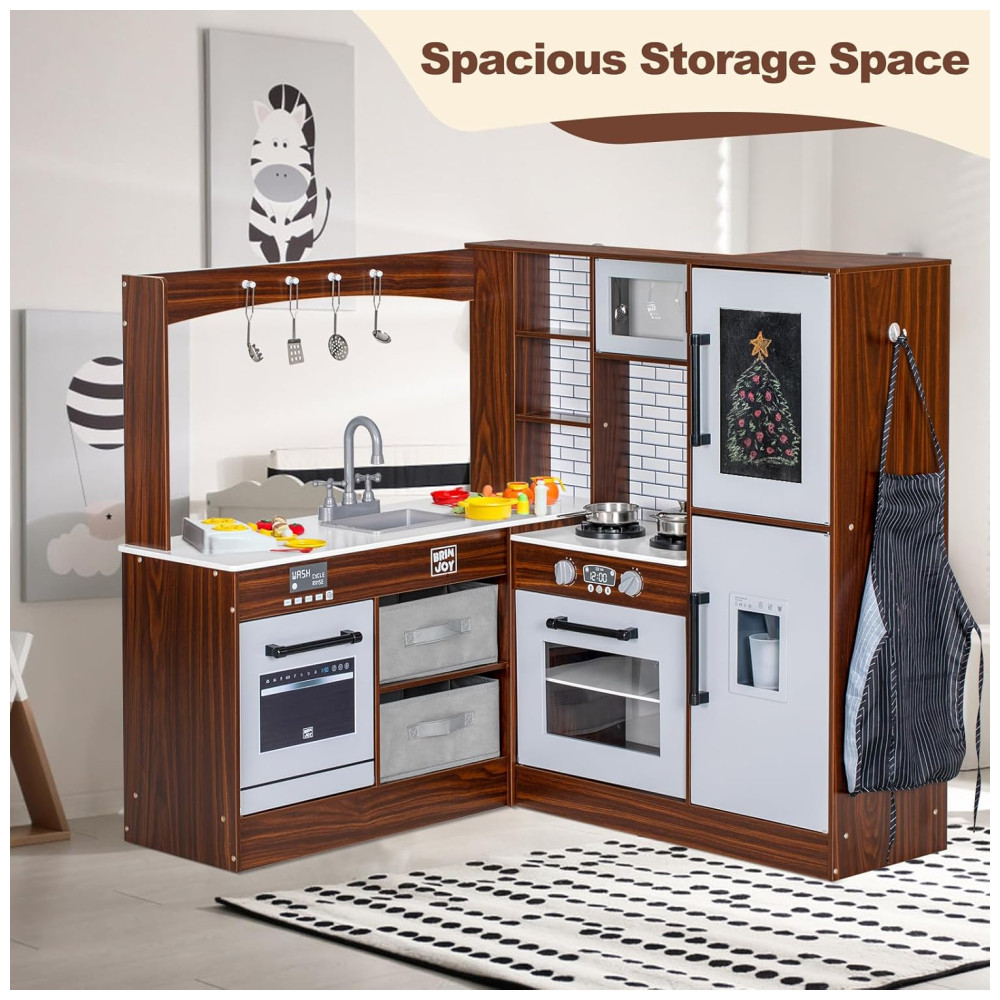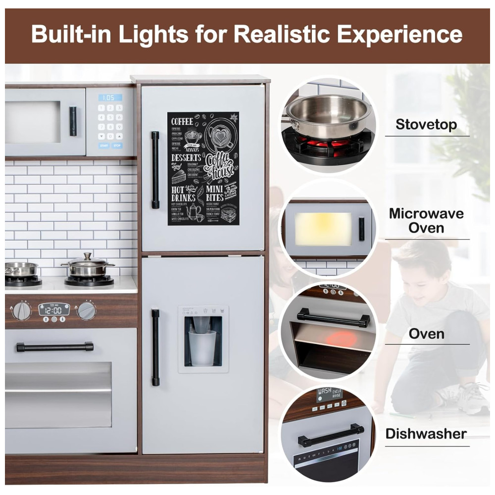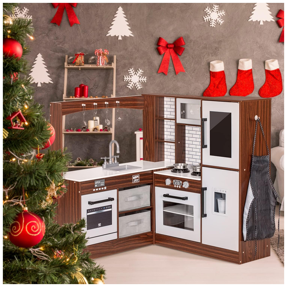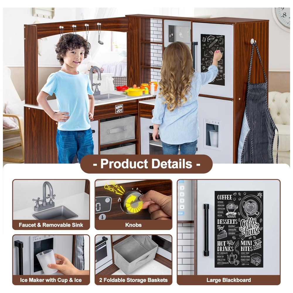Cozinha Infantil Modular em Madeira com Luz Som Pia Micro-Ondas Forno Avental e Quadro Negro BRINJOY Marrom