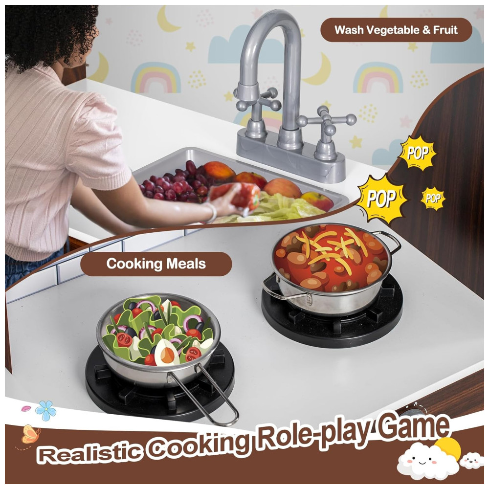 Esta cozinha infantil proporciona uma experiência culinária realista e divertida para as crianças. Com uma ampla variedade de materiais de cozinha, incluindo um fogão que emite sons de fritura e fervura quando uma panela é colocada sobre ele, e um forno equipado com luz para uma dramatização mais realista. O espaço de armazenamento é extremamente grande, com 5 armários de vários andares, 2 cestos de armazenamento e prateleiras de 3 níveis acima do balcão, permitindo que as crianças aprendam a organizar seus próprios brinquedos.